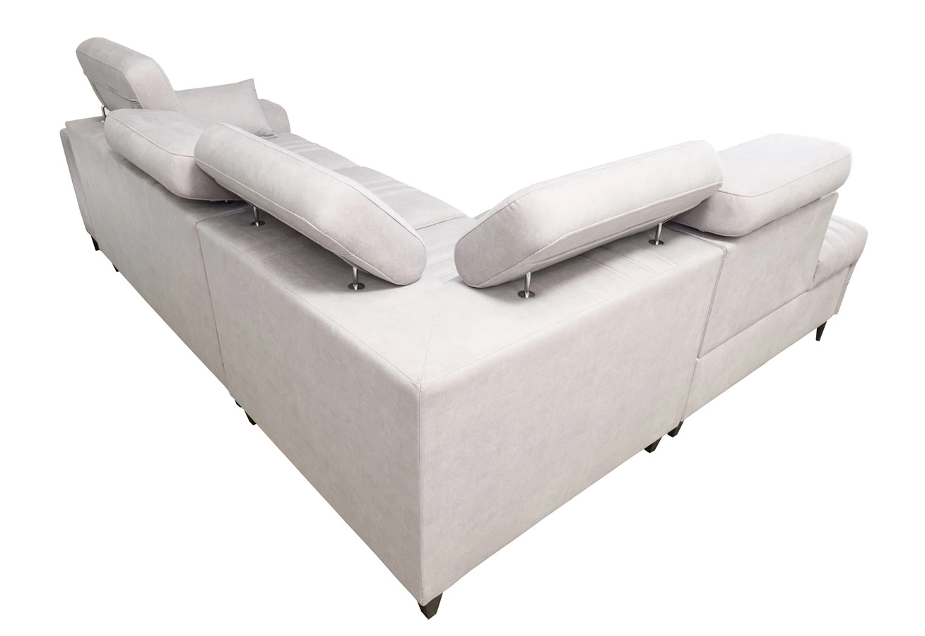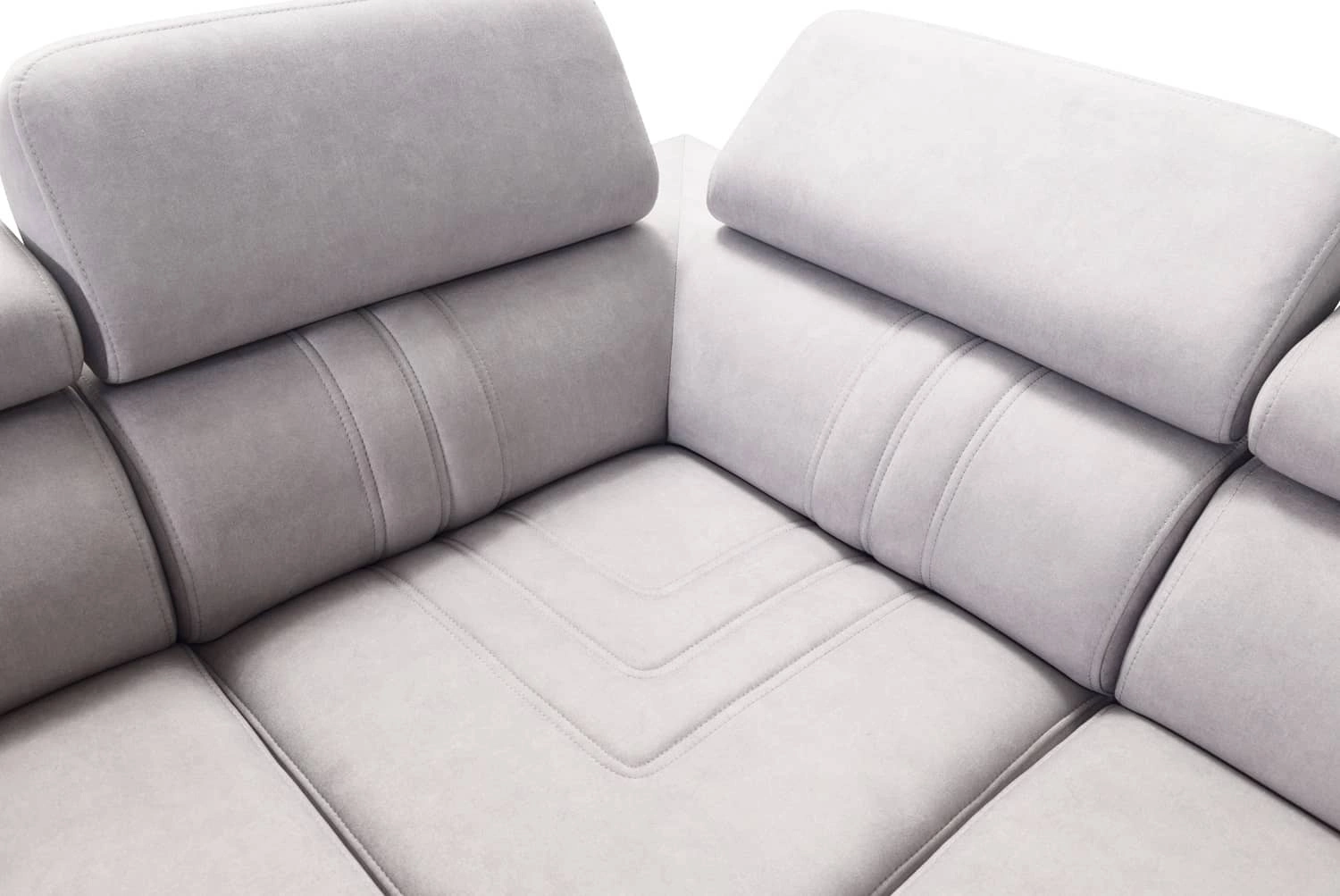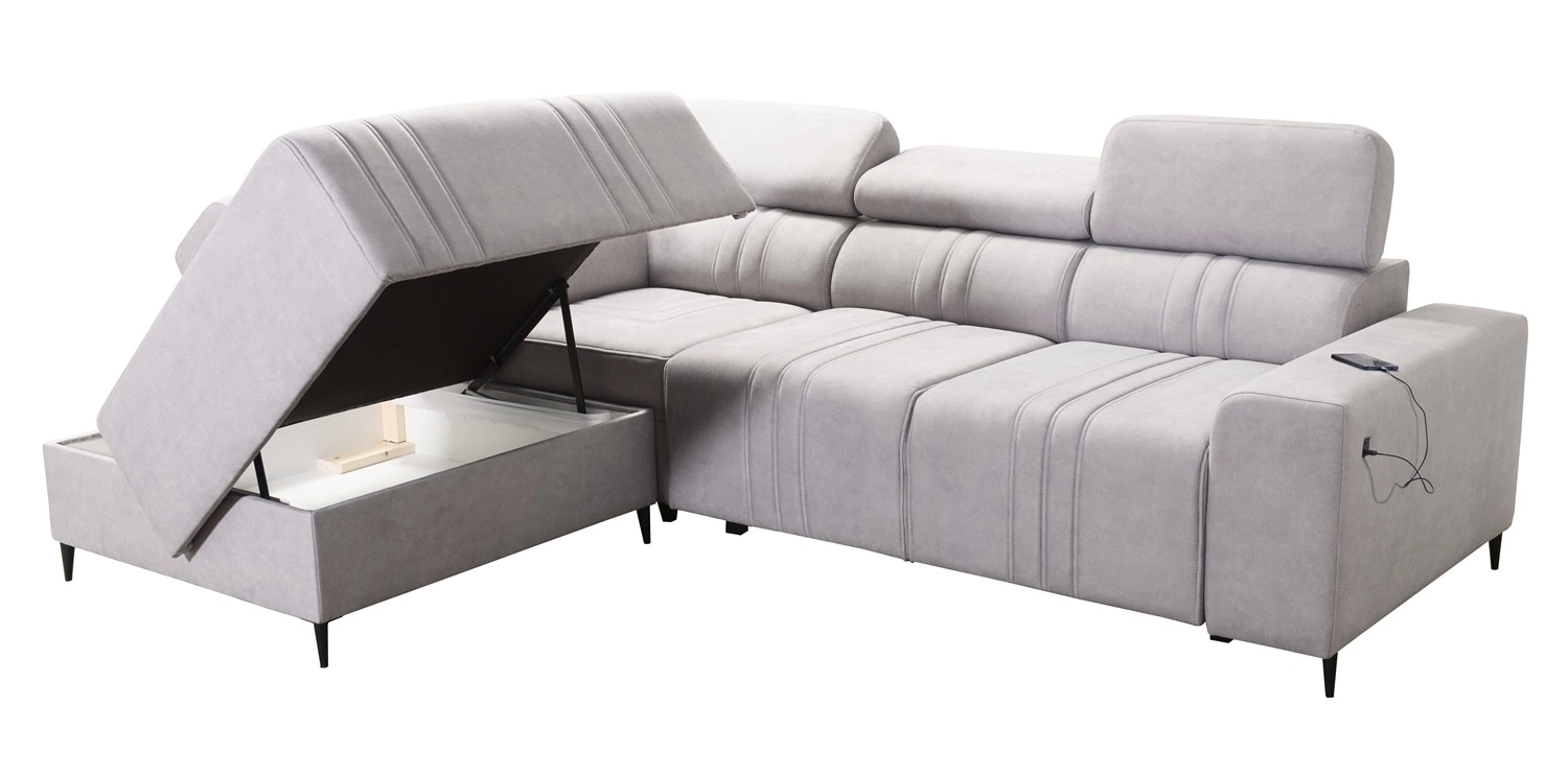 Die Extras dieses Möbels, die alle Benutzer schätzen werden, sind der Bettzeugbehälter, die verstellbaren Kopfstützen und die USB-Ladebuchse an der Seite des Eckmöbels.