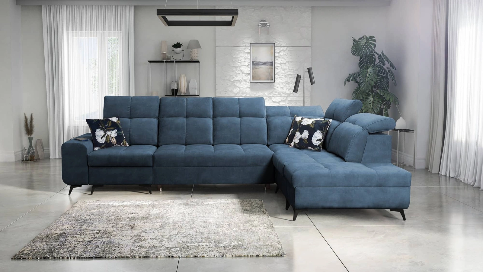 Ecksofa Buffalo XI in Blau mit verstellbaren Kopfstützen ist ein interessant aussehendes Möbelstück mit einer eleganten Ausführung.