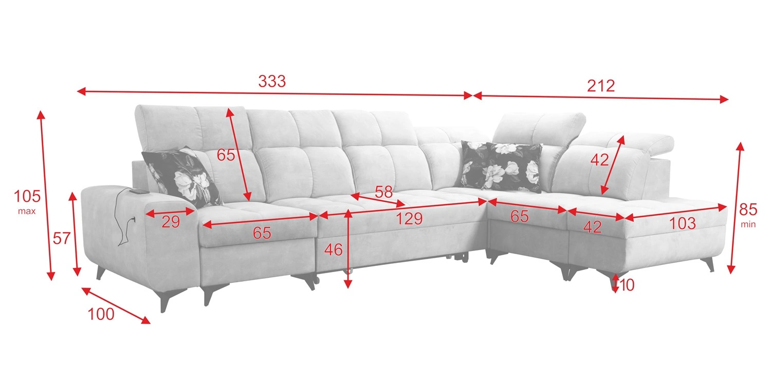 Die Abmessungen der Möbel ermöglichen füllung eines geräumigen Wohnzimmers oder Sitzungssaals. Breite der Ecke 333 cm, maximale Höhe 105 cm und Tiefe 212 cm. Die Liegefläche der Eckeinheit beträgt 129x190 cm. Die Sitzhöhe des Möbels beträgt 46 cm und die maximale Höhe der Rückenlehne beträgt 65 cm. Gewellte Federn und T30-Polyurethanschaum ist das Material, aus dem der Sitz der Ecke hergestellt ist. Feste Rückenlehne mit verstellbaren Kopfstützen ermöglicht eine einfache anpassung sie können die Neigung der Kopfstützen nach Ihren Wünschen einstellen und so für eine bequeme Erholung nach einem langen Tag sorgen, die Sie, Ihre Lieben und auch Ihre Gäste, die auf diesem einzigartigen Ecksofa Platz nehmen, zu schätzen wissen werden.