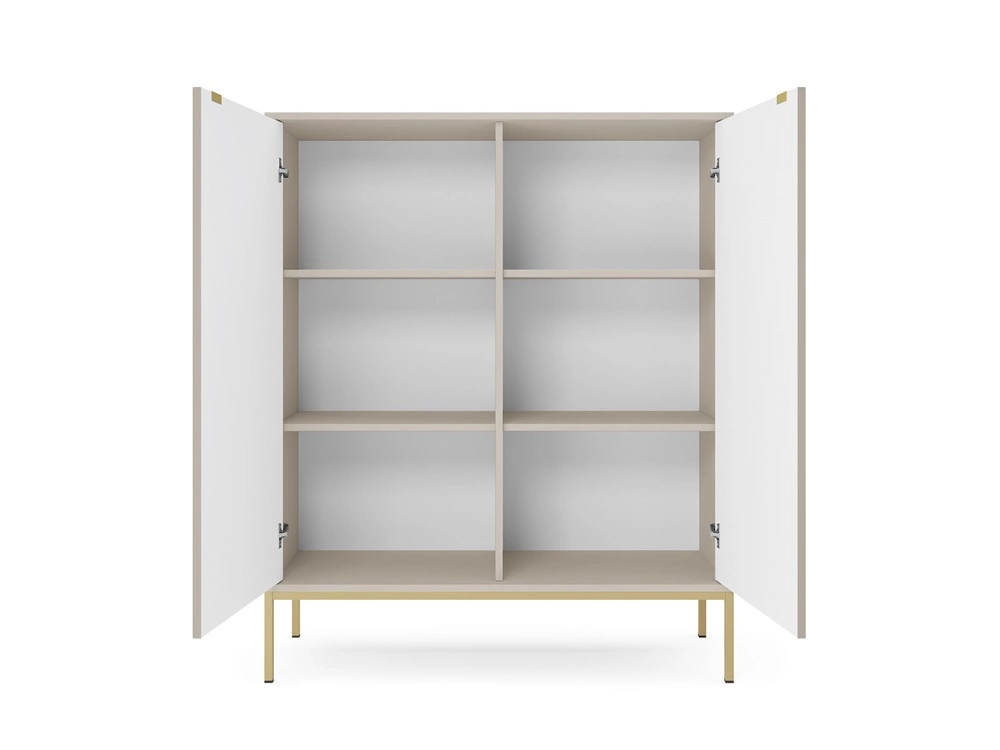 • Die Kommode Lovro hat ein modernes Design und passt perfekt ins Wohnzimmer, Esszimmer oder Büro. Der beige Farbton des Klumpens, kombiniert mit goldenen Accessoires, ist ideal für Loft- und Industrieumgebungen sowie für glamouröse Innenräume.