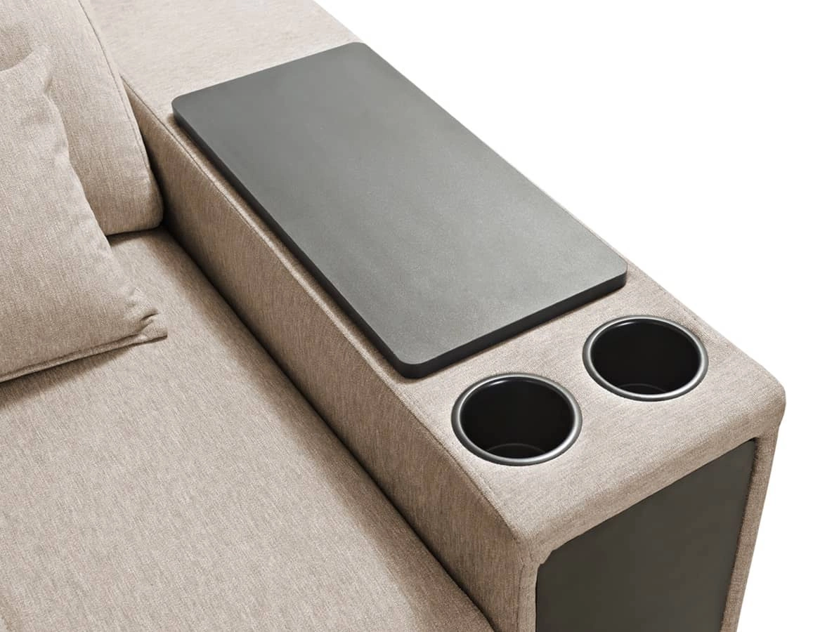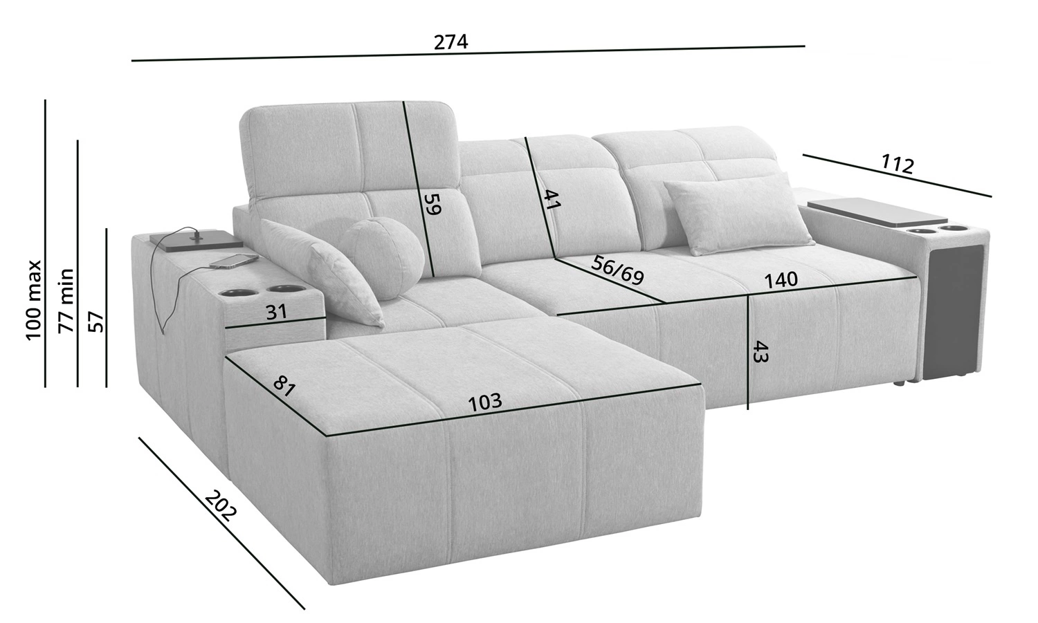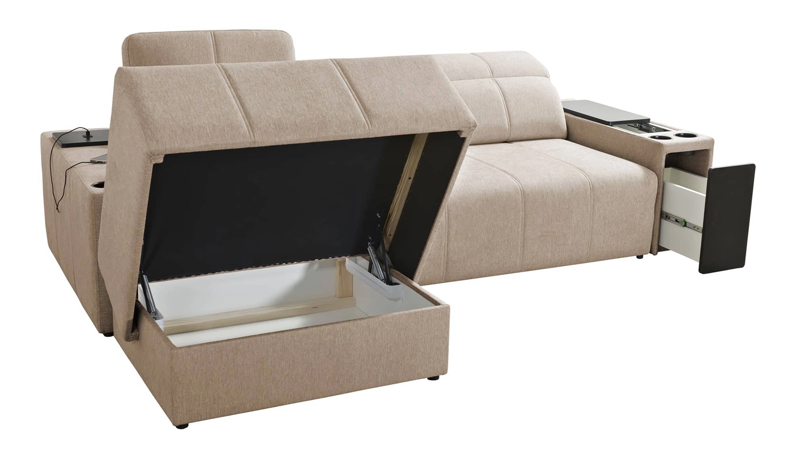 Die Extras dieses Möbelstücks, die alle Benutzer zu schätzen wissen, sind die verstellbaren Rückenlehnen, mit denen die Sitztiefe eingestellt werden kann, die Schublade und die Öffnungsleiste an der Seite der Ecke, die USB-Ladebuchse, die Becherhalter und der Bettzeugbehälter.