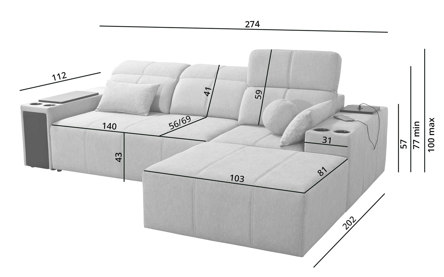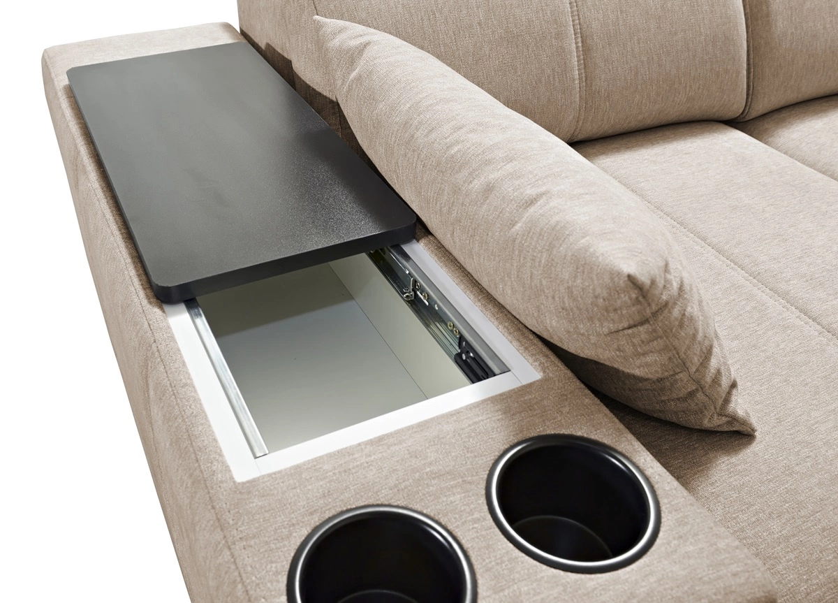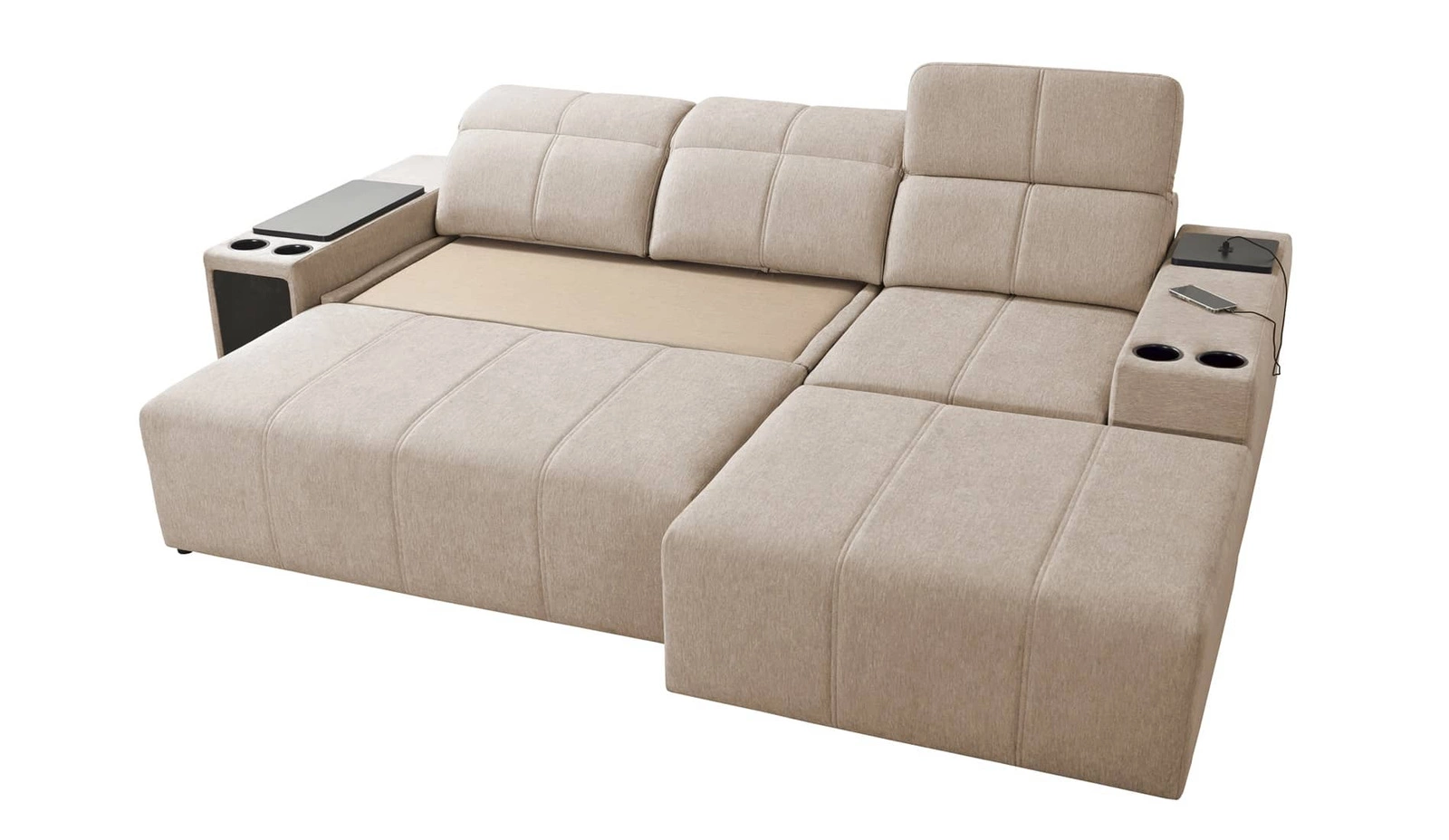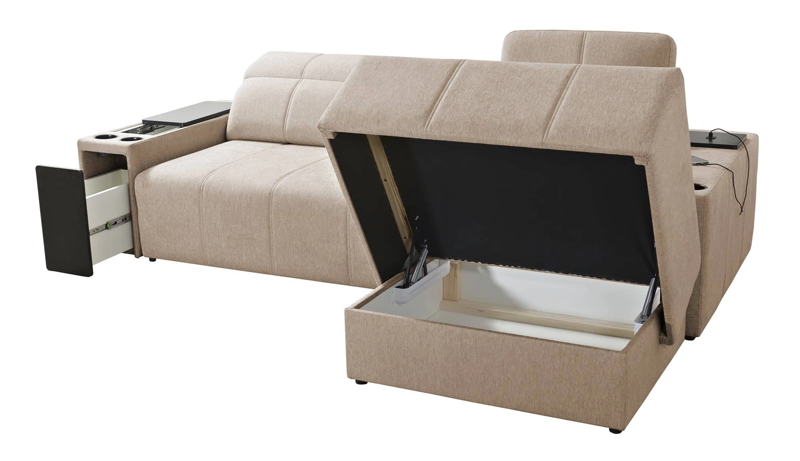 Die Extras dieses Möbelstücks, die alle Benutzer zu schätzen wissen, sind die verstellbaren Rückenlehnen, mit denen die Sitztiefe eingestellt werden kann, die Schublade und die Öffnungsleiste an der Seite der Ecke, die USB-Ladebuchse, die Becherhalter und der Bettzeugbehälter.