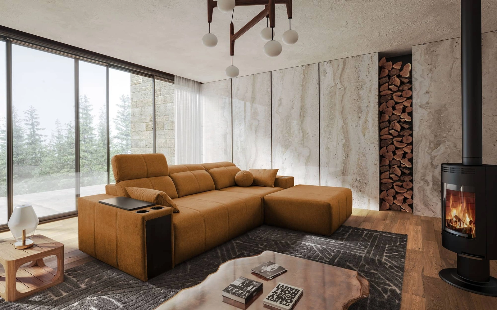 Ecksofa mit Schlaffunktion Tesalia Honig rechte Ecke modernes Design komfortable Schiebelehne Schublade in der Seite des Möbels