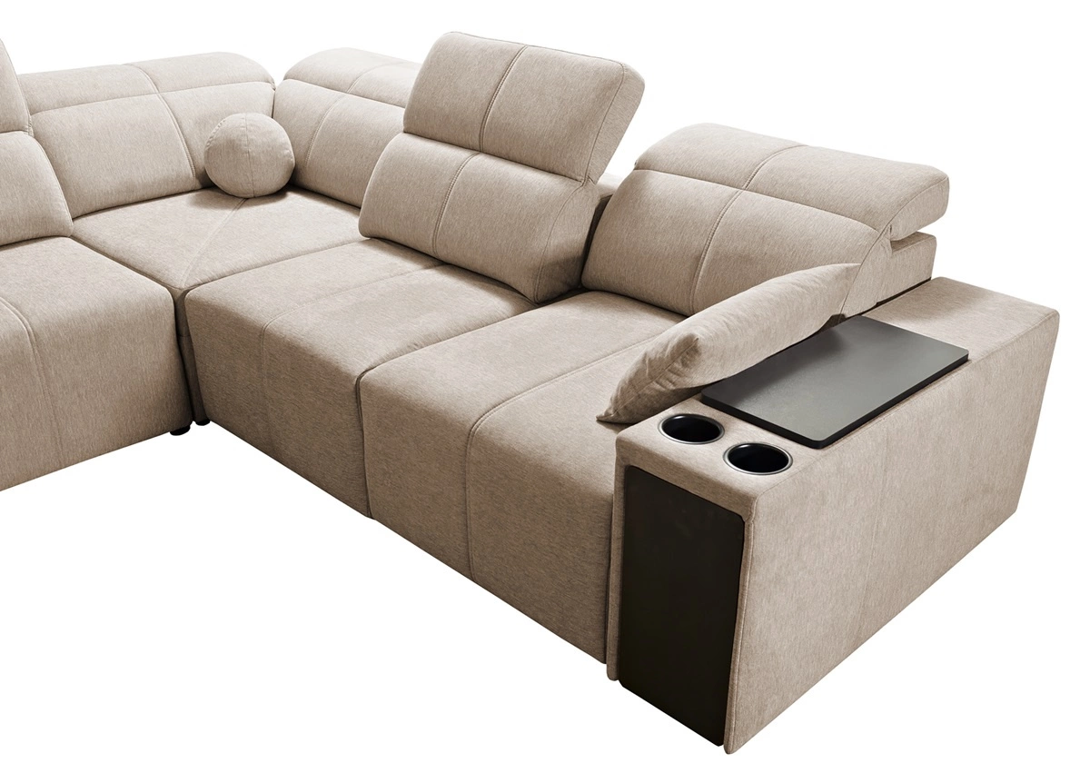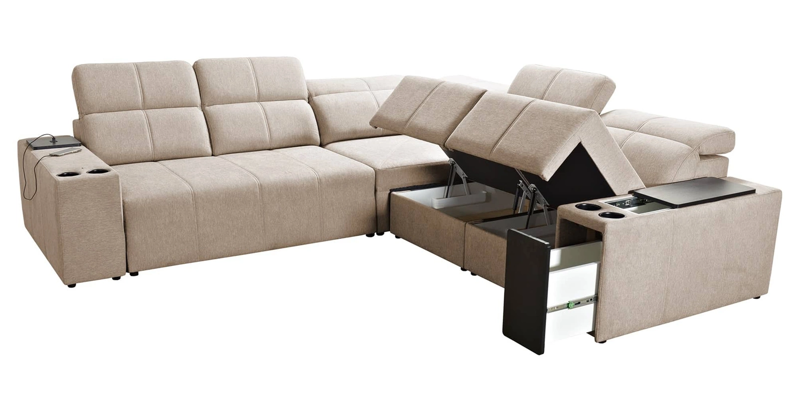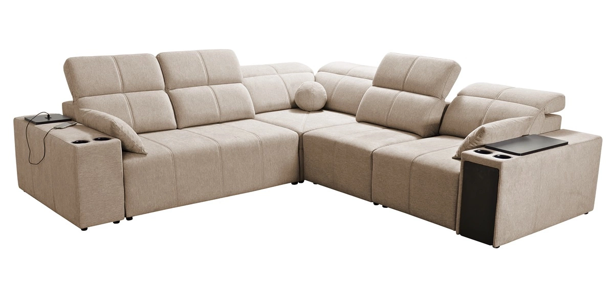 Die Extras dieses Möbelstücks, die alle Benutzer zu schätzen wissen, sind die verstellbaren Rückenlehnen, mit denen man die Sitztiefe einstellen kann, die Schublade und die Öffnungsleiste an der Seite der Ecke, die USB-Ladesteckdose, die Becherhalter und zwei Bettzeugbehälter.