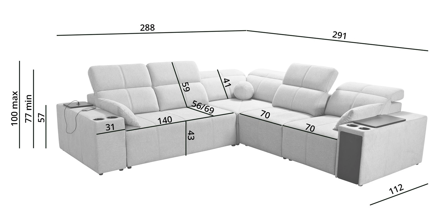 Die Abmessungen der Möbel ermöglichen füllung eines geräumigen Wohnzimmers oder Sitzungssaals. Breite der Ecke 288 cm, maximale Höhe 100 cm und Tiefe 291 cm. Die Liegefläche der Eckeinheit beträgt 138x212 cm. Die Sitzhöhe des Möbels beträgt 43 cm und die maximale Höhe der Rückenlehne beträgt 59 cm. Gewellte Federn und T30-Polyurethanschaum ist das Material, aus dem der Sitz der Ecke hergestellt ist. Rückenlehne mit verstellbaren Kopfstützen ermöglicht es Ihnen, den Winkel der Kopfstützen nach Ihren Wünschen einzustellen und garantiert Ihnen eine bequeme Erholung nach einem langen Tag, die Sie, Ihre Lieben und auch Ihre Gäste, die auf diesem einzigartigen Ecksofa sitzen, zu schätzen wissen werden.