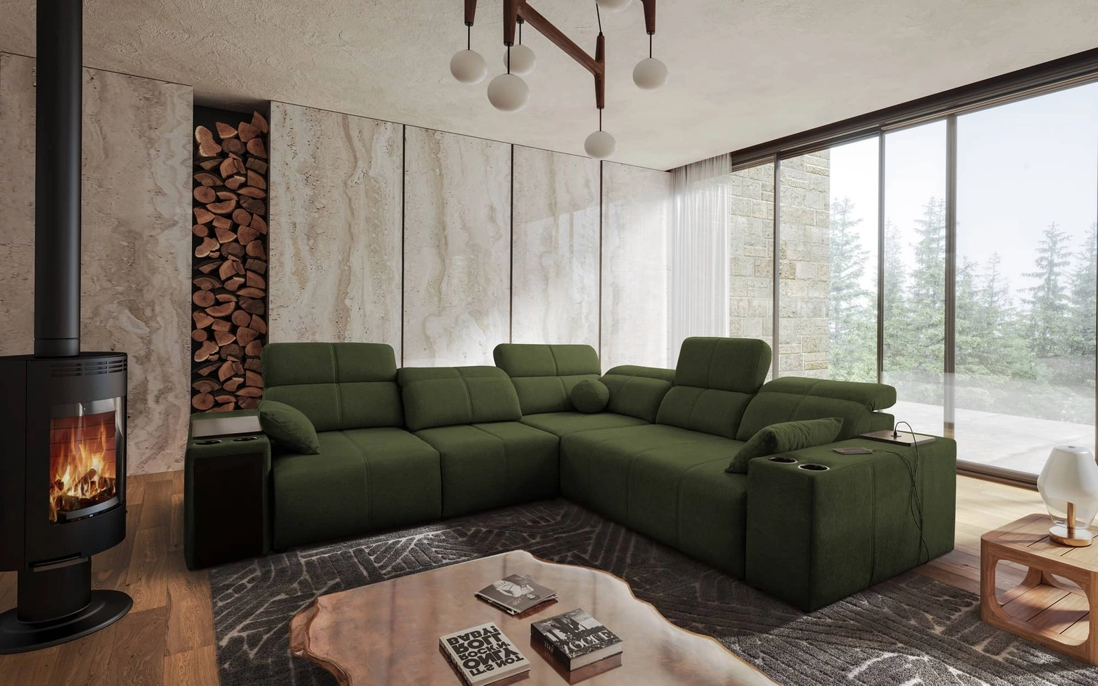 Ecksofa Tesalia III in Grün ist ein äußerst funktionelles Möbelstück mit einer stilvollen Oberfläche.