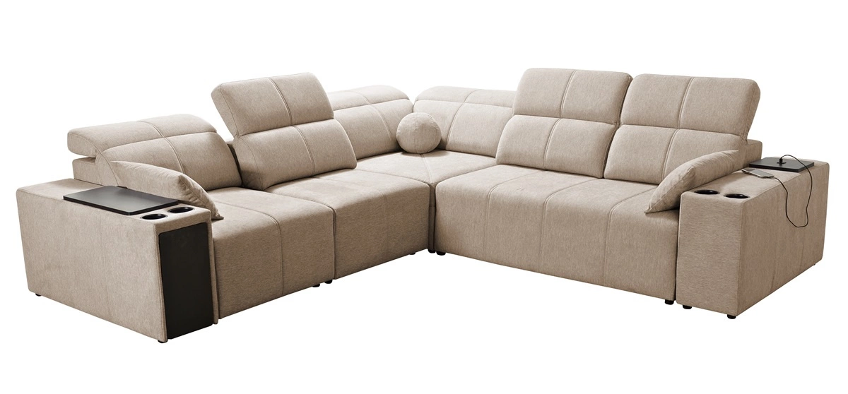 Die Extras dieses Möbelstücks, die alle Benutzer zu schätzen wissen, sind die verstellbaren Rückenlehnen, mit denen man die Sitztiefe einstellen kann, die Schublade und die Öffnungsleiste an der Seite der Ecke, die USB-Ladesteckdose, die Becherhalter und zwei Bettzeugbehälter.