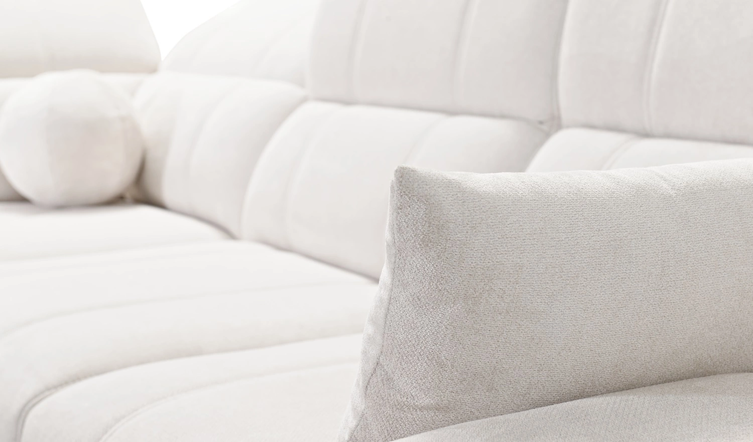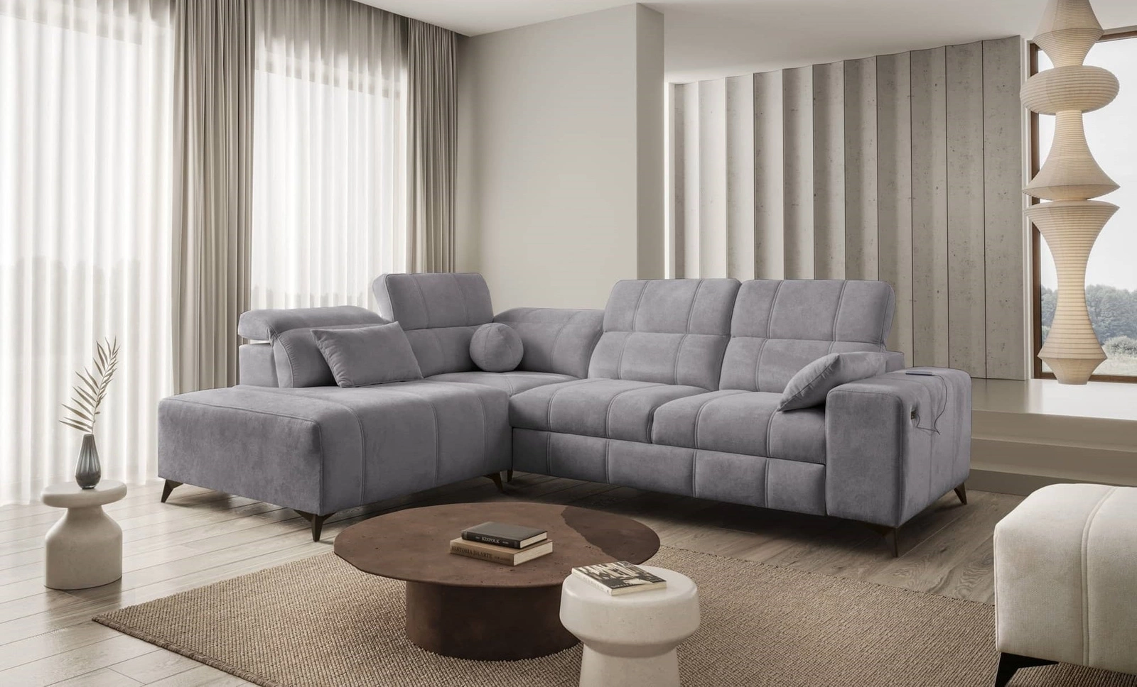 Penejos VII Ecksofa in Hellgrau mit verstellbaren Kopfstützen ist ein reizvolles Möbelstück mit der Garantie für höchsten Komfort und Funktionalität.