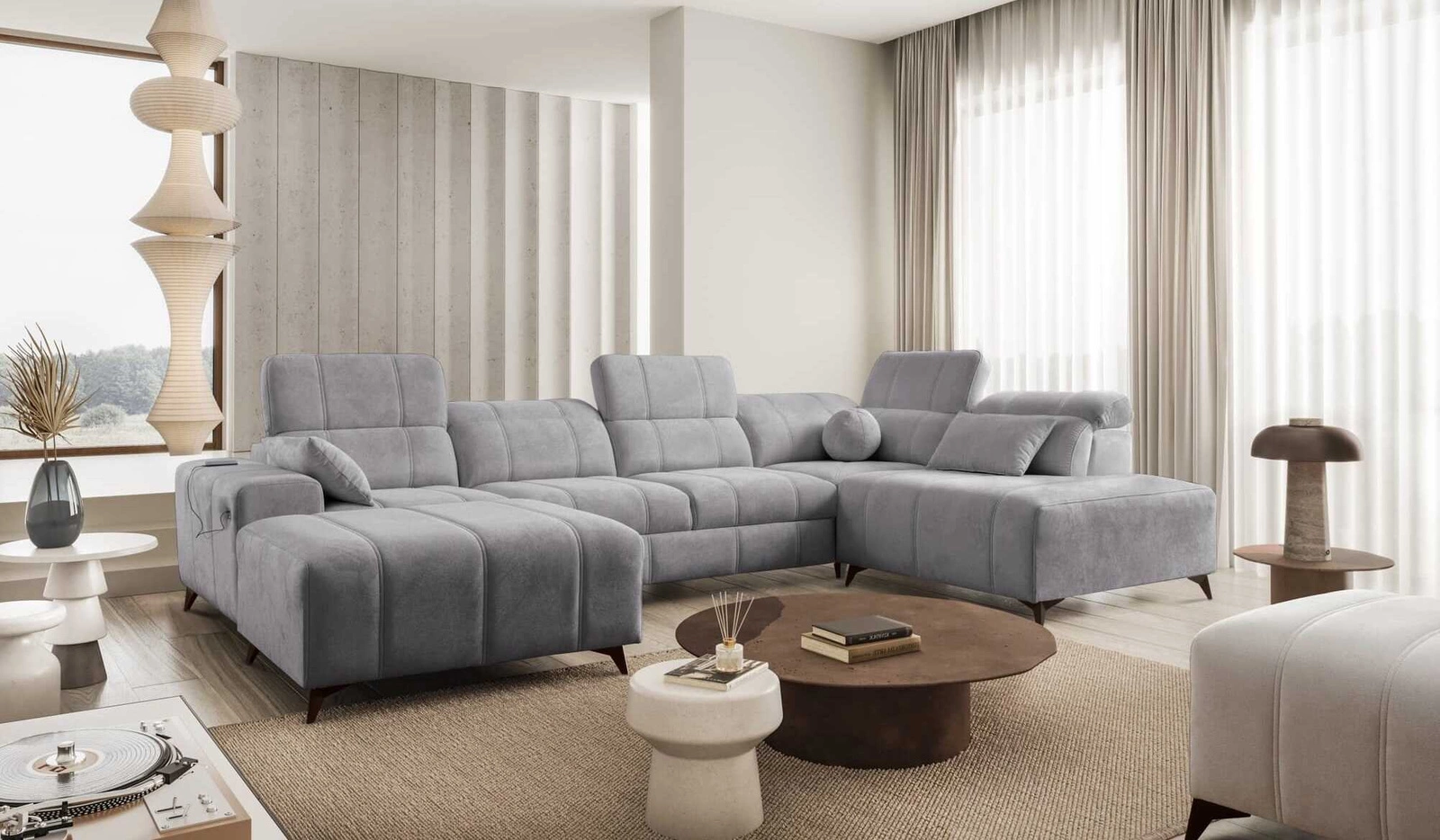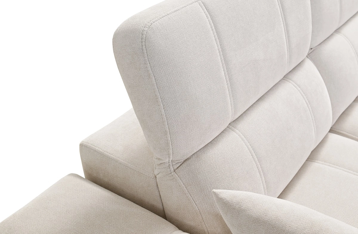 Ecksofa Penejos VI in Hellgrau mit verstellbaren Kopfstützen ist ein reizvolles Möbelstück mit der Garantie für höchsten Komfort und Funktionalität.