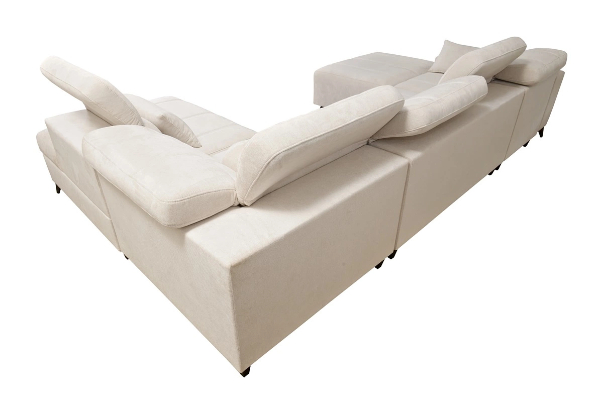 Abmessungen der Möbel ermöglichen füllung eines geräumigen Wohnzimmers oder Sitzungssaals. Breite der Ecke 345 cm, maximale Höhe 100 cm und Tiefe 216 cm. Die Liegefläche der Eckeinheit beträgt 127x268 cm. Die Sitzhöhe des Möbels beträgt 48 cm und die maximale Höhe der Rückenlehne beträgt 56 cm. Gewellte Federn und T30-Polyurethanschaum ist das Material, aus dem der Sitz der Ecke hergestellt ist. Feste Rückenlehne mit verstellbaren Kopfstützen ermöglicht eine einfache anpassung sie können die Neigung der Kopfstützen nach Ihren Wünschen einstellen und so für eine bequeme Erholung nach einem langen Tag sorgen, die Sie, Ihre Lieben und auch Ihre Gäste, die auf diesem einzigartigen Ecksofa Platz nehmen, zu schätzen wissen werden.