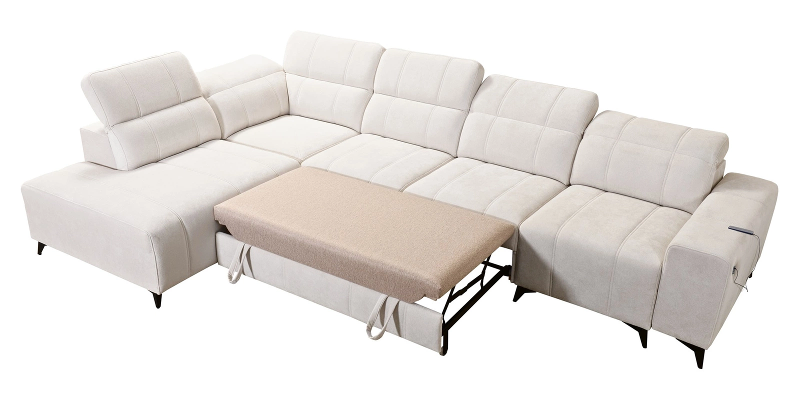 Die Extras dieses Möbels, die alle Nutzer zu schätzen wissen, sind die zwei Bettkästen, die Schlaffunktion und die USB-Ladebuchse an der Seite des Eckmöbels.