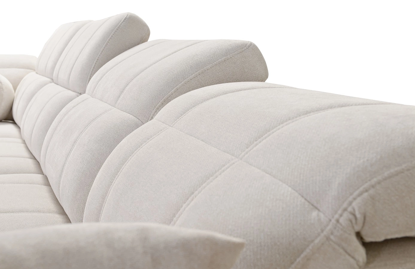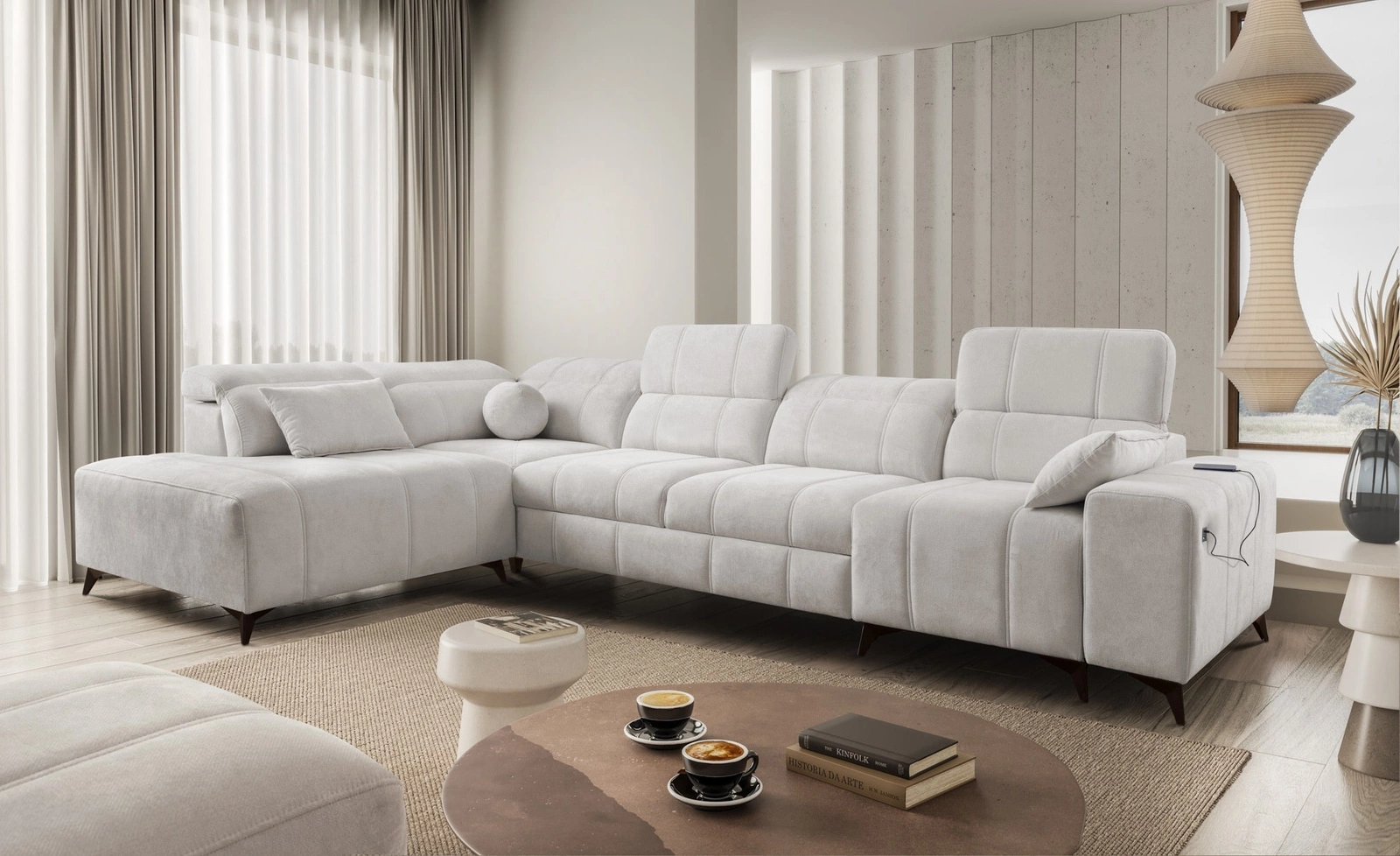 Ecksofa Penejos XI in grauer Esche mit verstellbaren Kopfstützen ist ein reizvolles Möbelstück mit der Garantie für höchsten Komfort und Funktionalität.