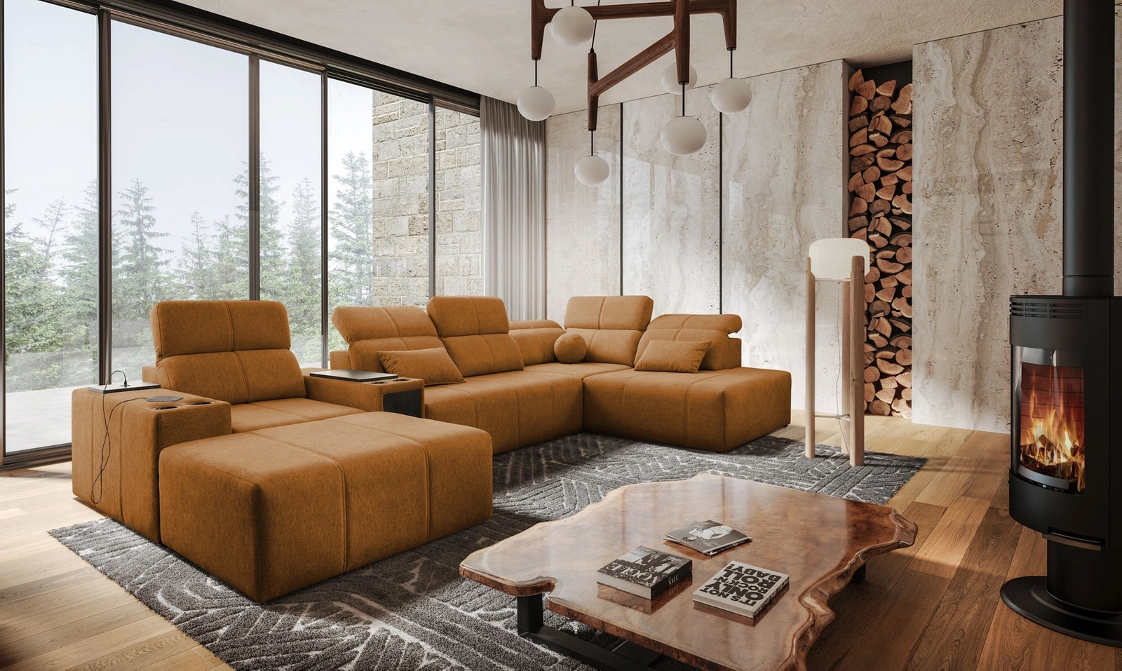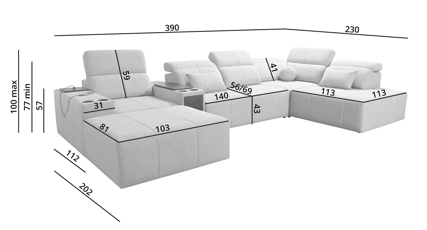 Die Abmessungen der Möbel ermöglichen füllung eines geräumigen Wohnzimmers oder Sitzungssaals. Breite der Ecke 390 cm, maximale Höhe 100 cm und einer Tiefe von 230 cm. Die Liegefläche der Eckeinheit beträgt 138x212 cm. Die Sitzhöhe des Möbels beträgt 43 cm und die maximale Höhe der Rückenlehne beträgt 59 cm. Gewellte Federn und T30-Polyurethanschaum ist das Material, aus dem der Sitz der Ecke hergestellt ist. Rückenlehne mit verstellbaren Kopfstützen ermöglicht es Ihnen, den Winkel der Kopfstützen nach Ihren Wünschen einzustellen und garantiert Ihnen eine bequeme Erholung nach einem langen Tag, die Sie, Ihre Lieben und auch Ihre Gäste, die auf diesem einzigartigen Ecksofa sitzen, zu schätzen wissen werden.