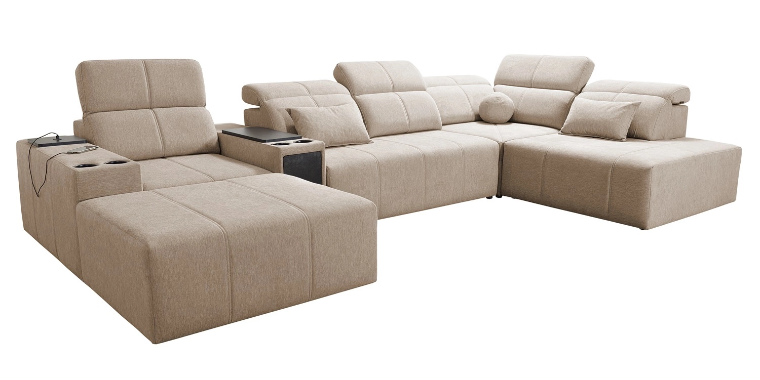 Zu den von allen Nutzern geschätzten Ausstattungsmerkmalen dieses Möbelstücks gehören die Schublade und der Öffnungsbügel an der Seite der Ecke, die USB-Ladebuchse, die Becherhalter, die verstellbaren Rückenlehnen zur Anpassung der Sitztiefe und zwei Bettzeugbehälter.