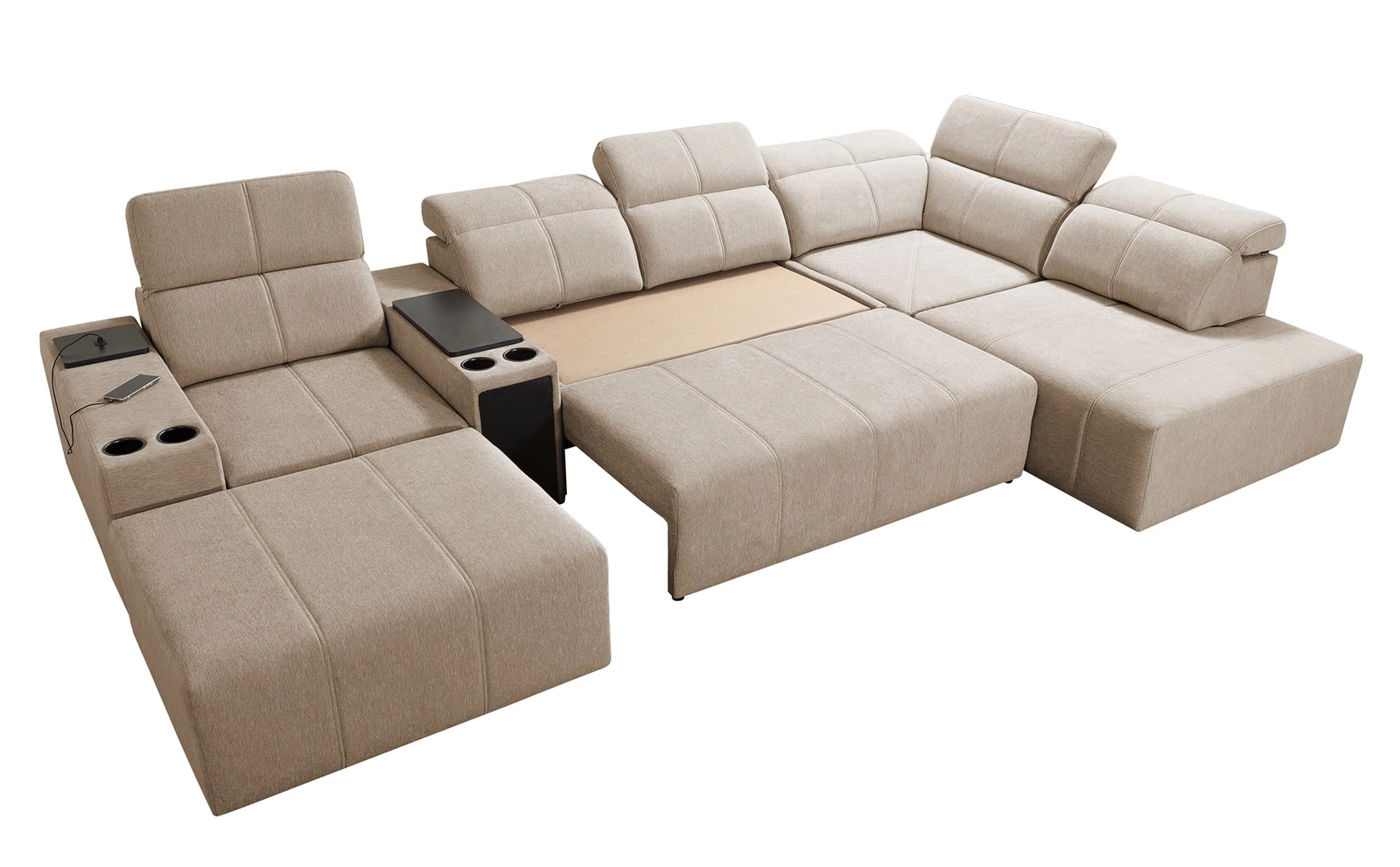 Zu den von allen Nutzern geschätzten Ausstattungsmerkmalen dieses Möbelstücks gehören die Schublade und der Öffnungsbügel an der Seite der Ecke, die USB-Ladebuchse, die Becherhalter, die verstellbaren Rückenlehnen zur Anpassung der Sitztiefe und zwei Bettzeugbehälter.