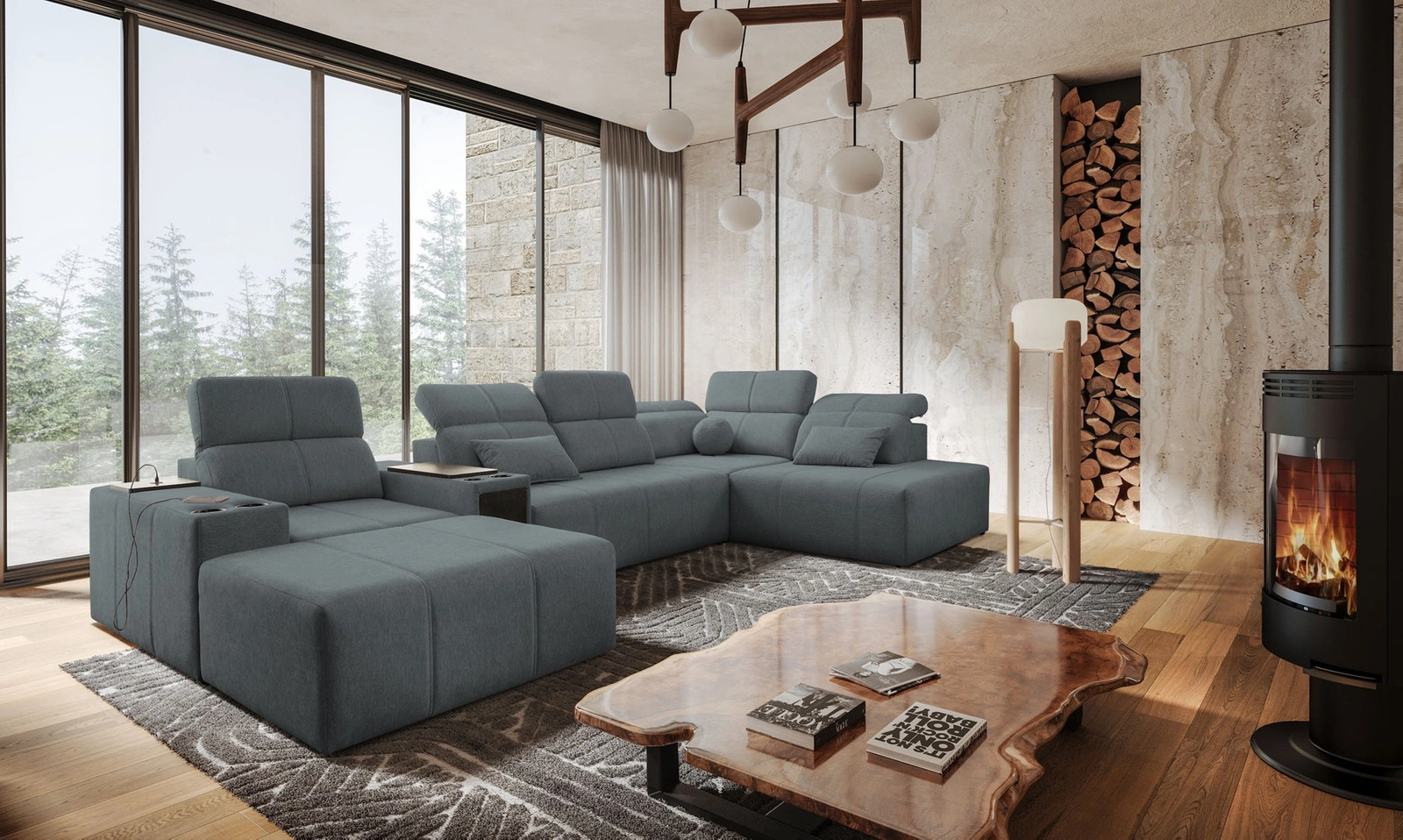Die Abmessungen der Möbel ermöglichen füllung eines geräumigen Wohnzimmers oder Sitzungssaals. Breite der Ecke 390 cm, maximale Höhe 100 cm und einer Tiefe von 230 cm. Die Liegefläche der Eckeinheit beträgt 138x212 cm. Die Sitzhöhe des Möbels beträgt 43 cm und die maximale Höhe der Rückenlehne beträgt 59 cm. Gewellte Federn und T30-Polyurethanschaum ist das Material, aus dem der Sitz der Ecke hergestellt ist. Rückenlehne mit verstellbaren Kopfstützen ermöglicht es Ihnen, den Winkel der Kopfstützen nach Ihren Wünschen einzustellen und garantiert Ihnen eine bequeme Erholung nach einem langen Tag, die Sie, Ihre Lieben und auch Ihre Gäste, die auf diesem einzigartigen Ecksofa sitzen, zu schätzen wissen werden.