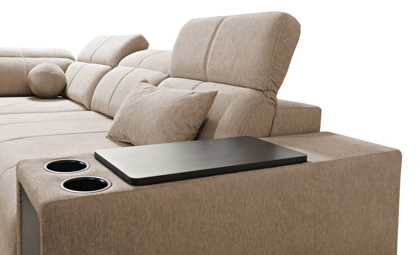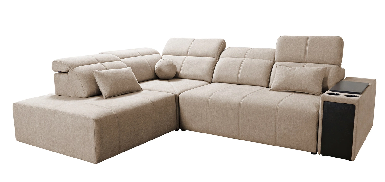 Die Extras dieses Möbelstücks, die alle Benutzer zu schätzen wissen, sind die verstellbaren Rückenlehnen, mit denen die Sitztiefe eingestellt werden kann, die Schublade und die Öffnungsleiste an der Seite der Ecke, die USB-Ladebuchse, die Becherhalter und der Bettzeugbehälter.