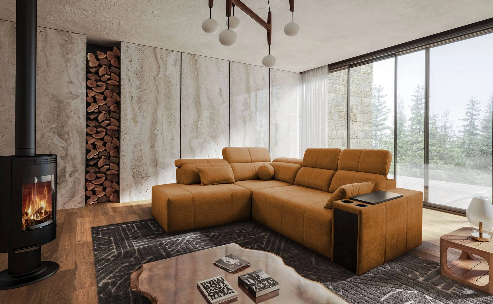 Ecksofa mit Schlaffunktion Tesalia VII Honig links modernes Design komfortable Schiebe-Rückenlehne Schublade in der Seite des Möbels