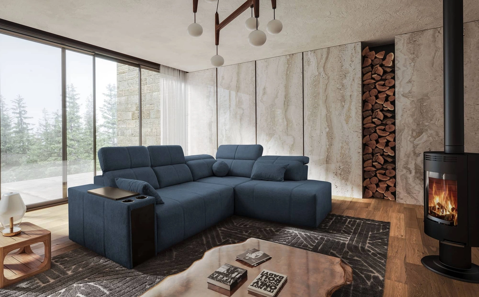 Ecksofa mit Schlaffunktion Tesalia VII blau rechte Ecke modernes Design komfortable Schiebelehne Schublade in der Seite des Möbels