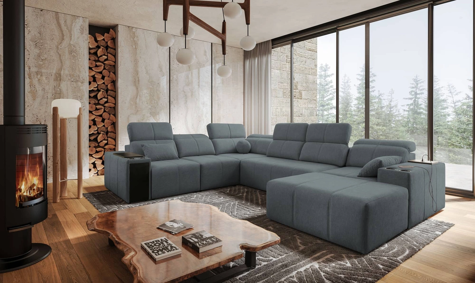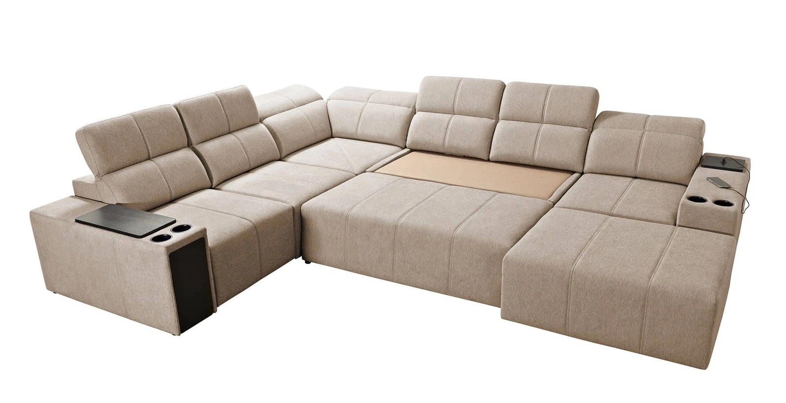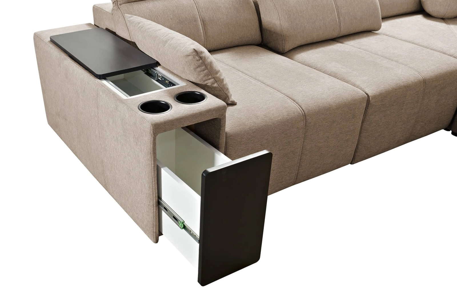 Die Extras dieses Möbelstücks, die alle Benutzer zu schätzen wissen, sind die verstellbaren Rückenlehnen, mit denen sich die Sitztiefe einstellen lässt, die Schublade und die Öffnungsleiste an der Seite der Ecke, die USB-Ladesteckdose, die Becherhalter und die drei Bettzeugbehälter.