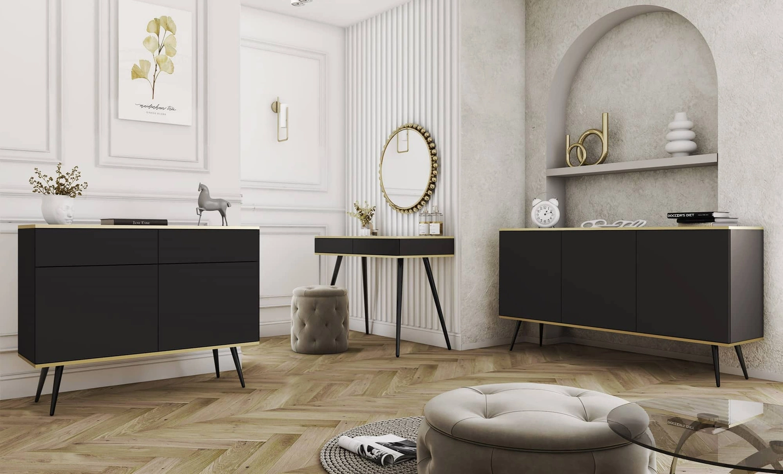 Die Konsole aus der Luxury-Kollektion wird alle Liebhaber von raffinierten Arrangements begeistern. Die Möbel zeichnen sich durch ihre Schlichtheit und Eleganz aus und überraschen durch ihre breite Funktionalität. Klassisch schwarz verleiht dem Innenraum ein einzigartiges Aussehen und Gefühl. Goldstreifen die Einfassung um den Korpus des Schminktisches für das Schlafzimmer verleiht dem Möbel einen ungewöhnlichen Abschluss. Beine aus Metall in schwarz optische Leichtigkeit bei gleichzeitiger Funktionalität. Grifflose Fronten die Komposition der Konsole kohärent und in einem minimalistischen Ton gehalten zu gestalten.