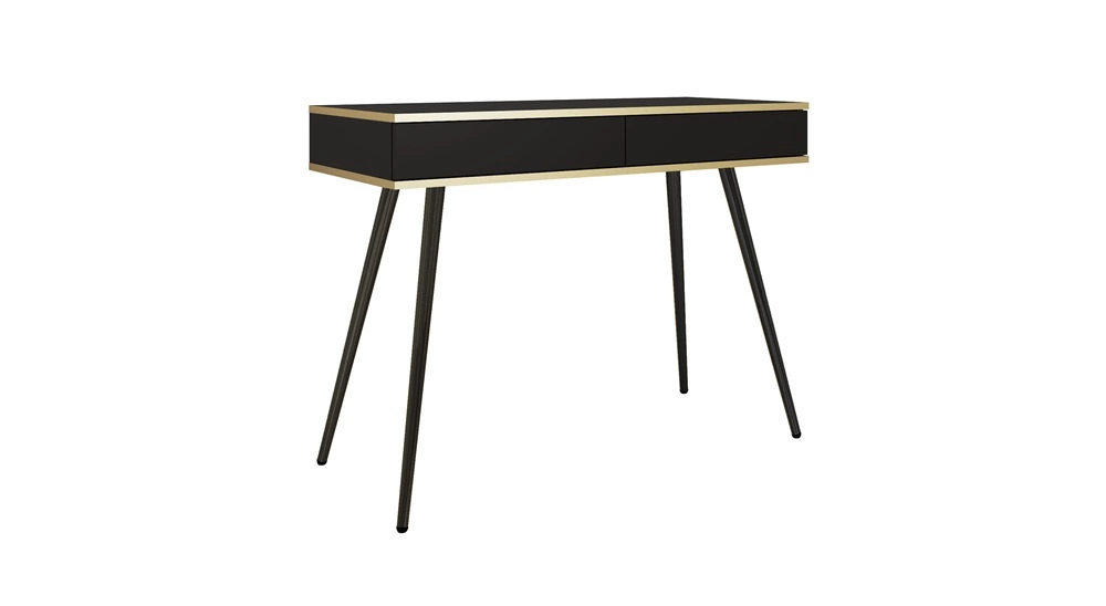 Luxuriöse schwarze Konsole mit Schubladen stilvolle und elegante Schminktisch auf hohen Metallbeinen Körper mit goldenen trim gekrönt unterstützt