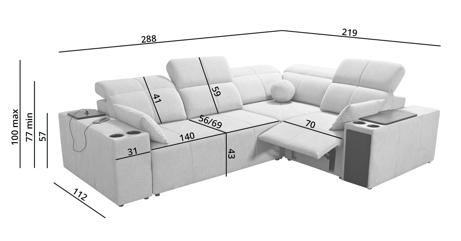 Die Abmessungen der Möbel ermöglichen füllung eines geräumigen Wohnzimmers oder Sitzungssaals. Breite der Ecke 288 cm, maximale Höhe 100 cm und Tiefe 219 cm. Die Liegefläche der Eckeinheit beträgt 138x212 cm. Die Sitzhöhe des Möbels beträgt 43 cm und die maximale Höhe der Rückenlehne beträgt 59 cm. Gewellte Federn und T30-Polyurethanschaum ist das Material, aus dem der Sitz der Ecke hergestellt ist. Rückenlehne mit verstellbaren Kopfstützen ermöglicht es Ihnen, den Winkel der Kopfstützen nach Ihren Wünschen einzustellen und garantiert Ihnen eine bequeme Erholung nach einem langen Tag, die Sie, Ihre Lieben und auch Ihre Gäste, die auf diesem einzigartigen Ecksofa sitzen, zu schätzen wissen werden.