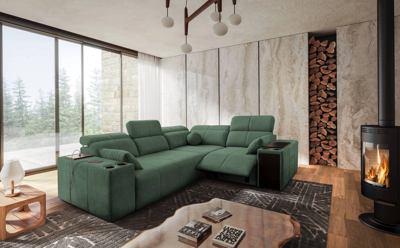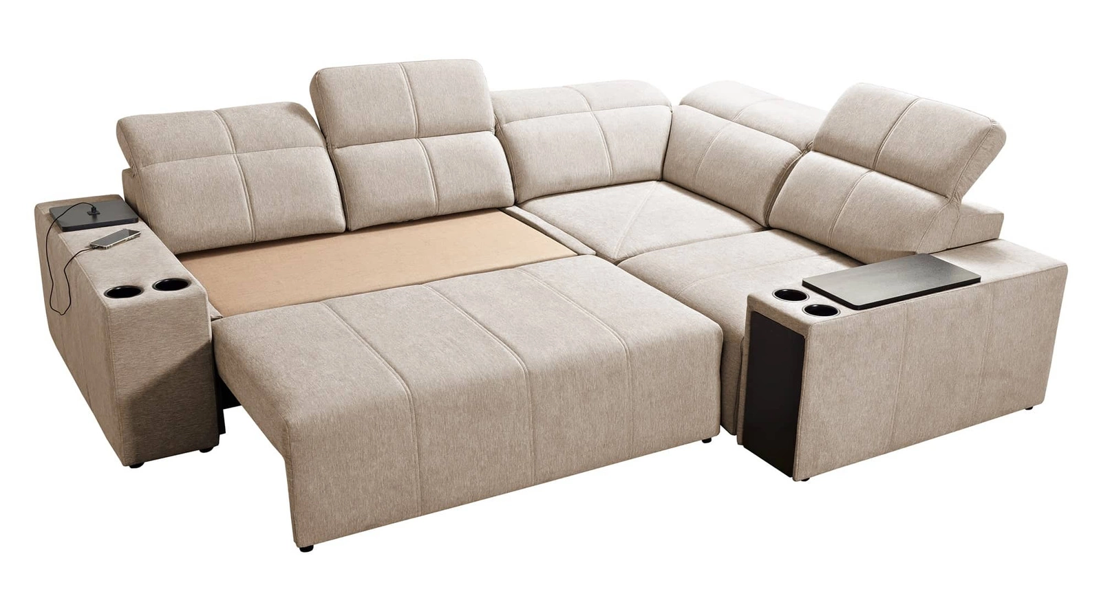 Die Extras dieses Möbels, die alle Benutzer zu schätzen wissen, sind die verstellbaren Rückenlehnen, mit denen sich die Sitztiefe einstellen lässt, die ausziehbare Fußstütze, die Schublade und die Öffnungsleiste an der Seite der Ecke, die USB-Ladebuchse und die Becherhalter.