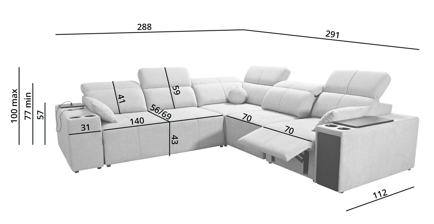Die Abmessungen der Möbel ermöglichen füllung eines geräumigen Wohnzimmers oder Sitzungssaals. Breite der Ecke 288 cm, maximale Höhe 100 cm und Tiefe 291 cm. Die Liegefläche der Eckeinheit beträgt 138x212 cm. Die Sitzhöhe des Möbels beträgt 43 cm und die maximale Höhe der Rückenlehne beträgt 59 cm. Gewellte Federn und T30-Polyurethanschaum ist das Material, aus dem der Sitz der Ecke hergestellt ist. Rückenlehne mit verstellbaren Kopfstützen ermöglicht es Ihnen, den Winkel der Kopfstützen nach Ihren Wünschen einzustellen und garantiert Ihnen eine bequeme Erholung nach einem langen Tag, die Sie, Ihre Lieben und auch Ihre Gäste, die auf diesem einzigartigen Ecksofa sitzen, zu schätzen wissen werden.
