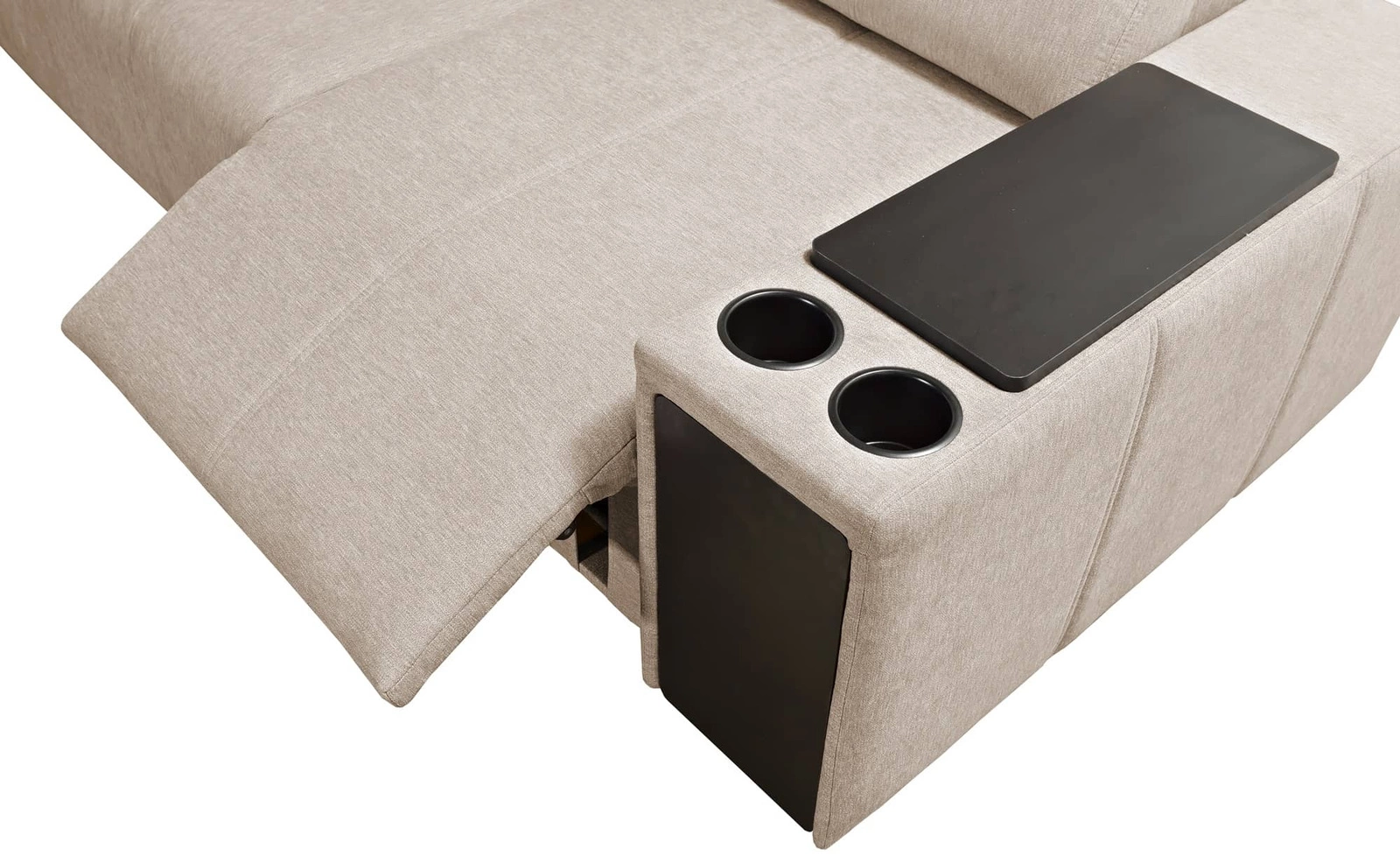 Zu den Extras dieses Möbelstücks, die alle Benutzer zu schätzen wissen, gehören die ausziehbare Fußstütze, die verstellbaren Rückenlehnen, die eine Anpassung der Sitztiefe ermöglichen, eine Schublade und eine Öffnungsleiste an der Seite der Ecke, eine USB-Ladebuchse, Becherhalter und ein Bettzeugbehälter.