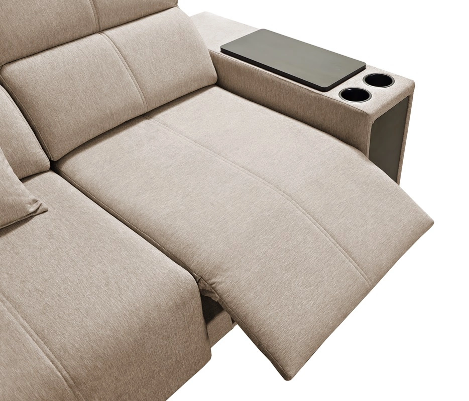 Zu den Extras dieses Möbelstücks, die alle Benutzer zu schätzen wissen, gehören die ausziehbare Fußstütze, die verstellbaren Rückenlehnen, die eine Anpassung der Sitztiefe ermöglichen, eine Schublade und eine Öffnungsleiste an der Seite der Ecke, eine USB-Ladebuchse, Becherhalter und ein Bettzeugbehälter.