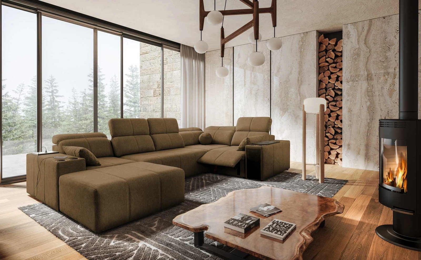 Ecksofa Tesalia IV Lux in braun mit ausziehbarer Fußstütze ist ein äußerst bequemes Möbelstück mit interessanter Oberfläche.