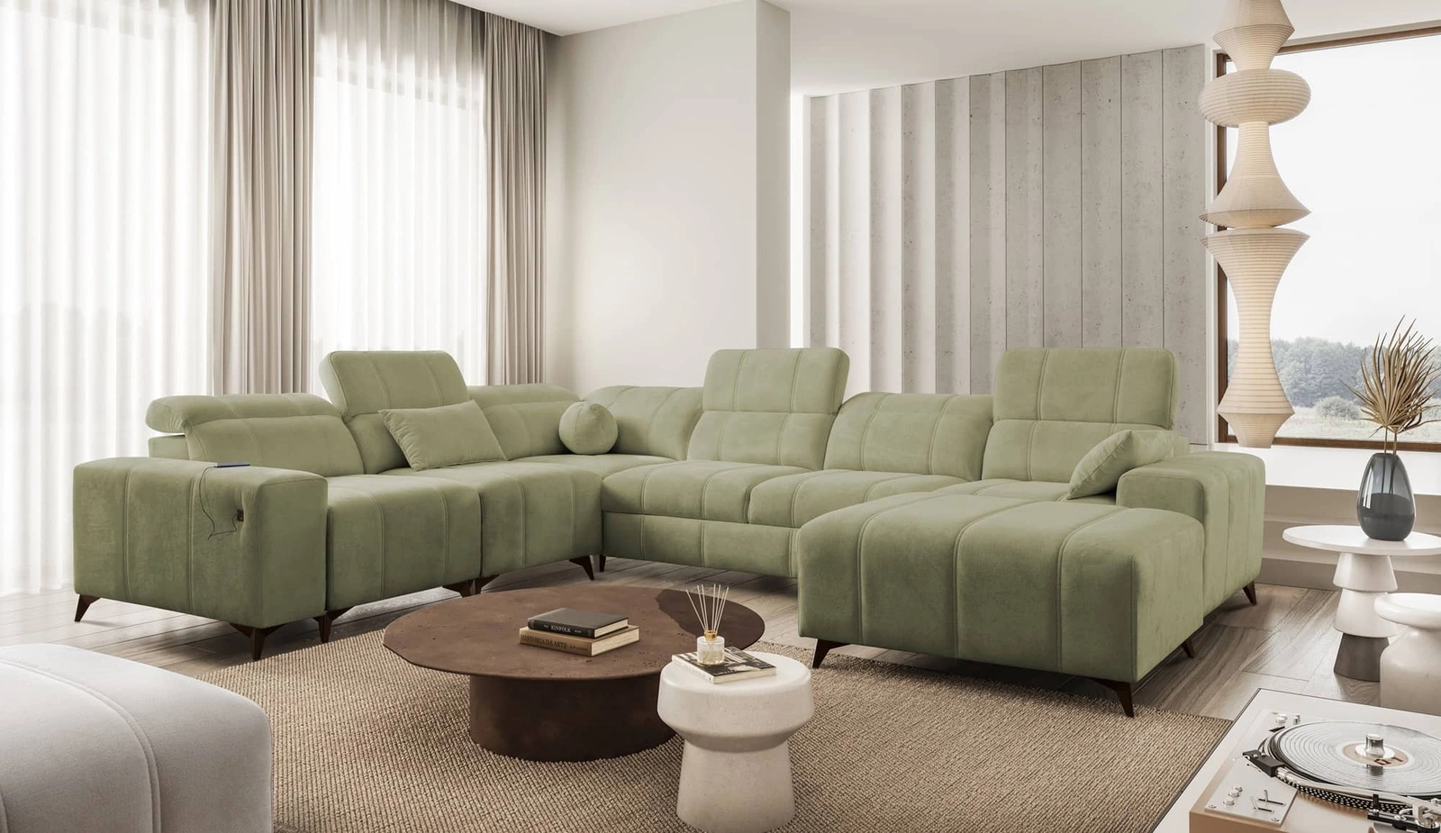 Ecksofa Penejos VIII in Olivgrün mit verstellbaren Kopfstützen ist ein reizvolles Möbelstück mit der Garantie für höchsten Komfort und Funktionalität.