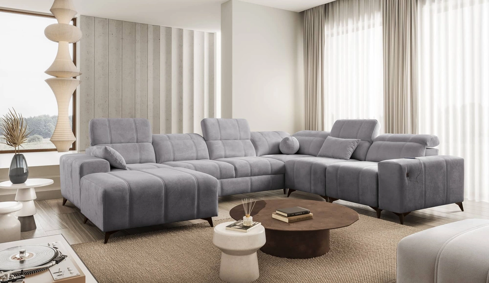 Ecksofa Penejos VIII in Hellgrau mit verstellbaren Kopfstützen ist ein reizvolles Möbelstück mit der Garantie für höchsten Komfort und Funktionalität.
