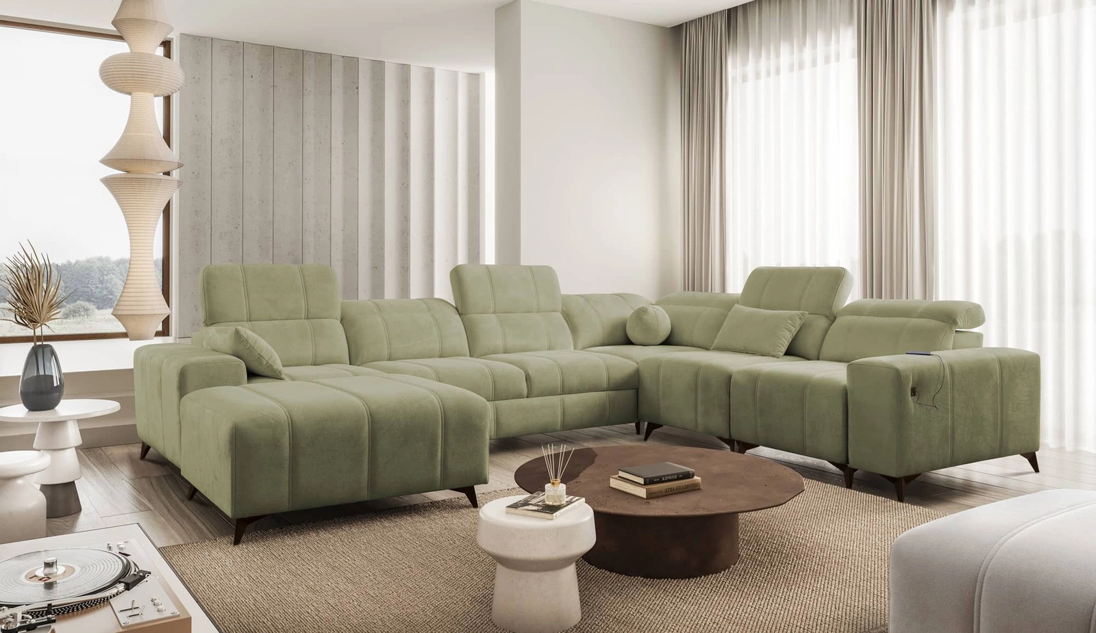 Ecksofa Penejos VIII in Olivgrün mit verstellbaren Kopfstützen ist ein reizvolles Möbelstück mit der Garantie für höchsten Komfort und Funktionalität.