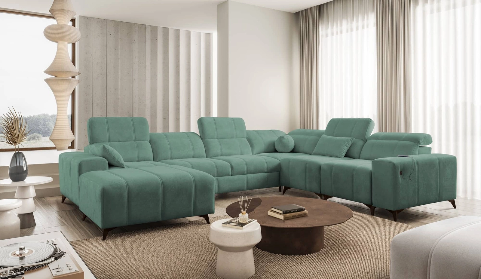 Ecksofa Penejos VIII in grün mit verstellbaren Kopfstützen ist ein reizvolles Möbelstück mit der Garantie für höchsten Komfort und Funktionalität.