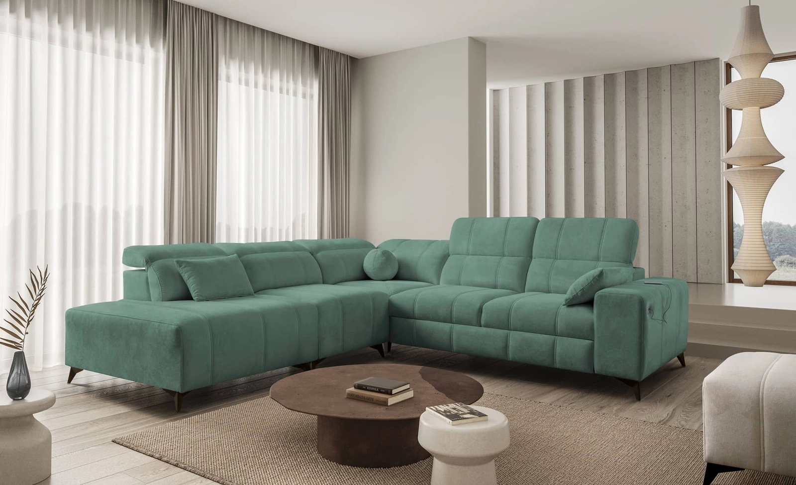 Ecksofa Penejos IX in grün mit verstellbaren Kopfstützen ist ein reizvolles Möbelstück mit der Garantie für höchsten Komfort und Funktionalität.