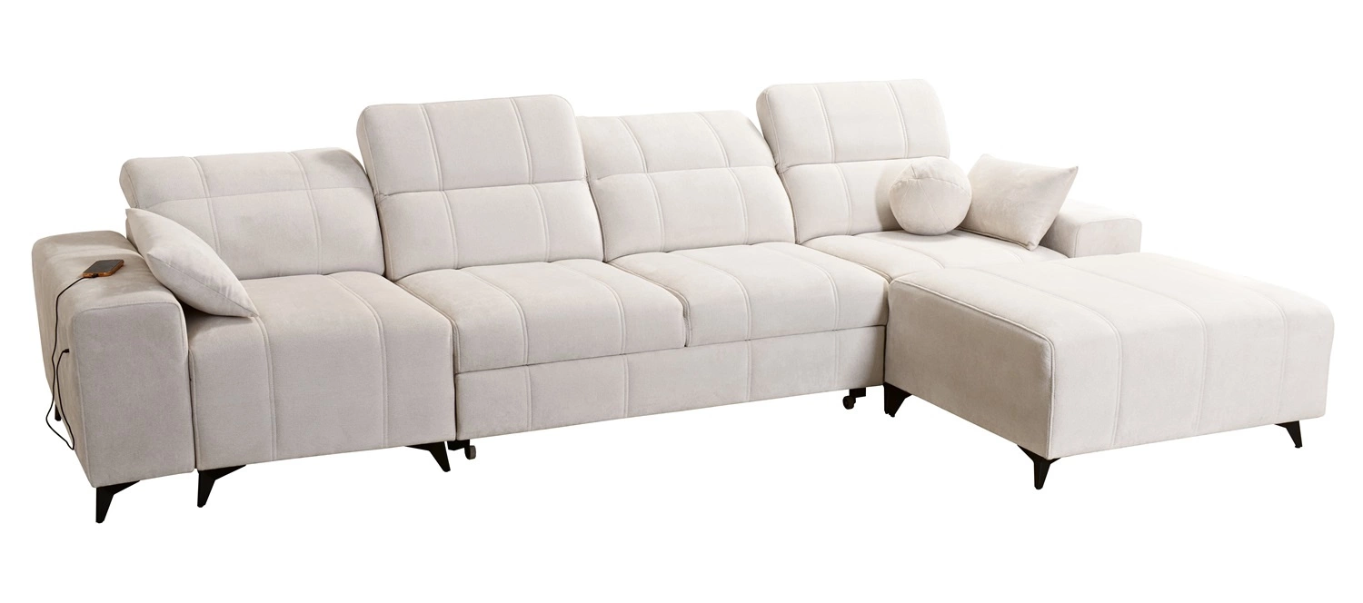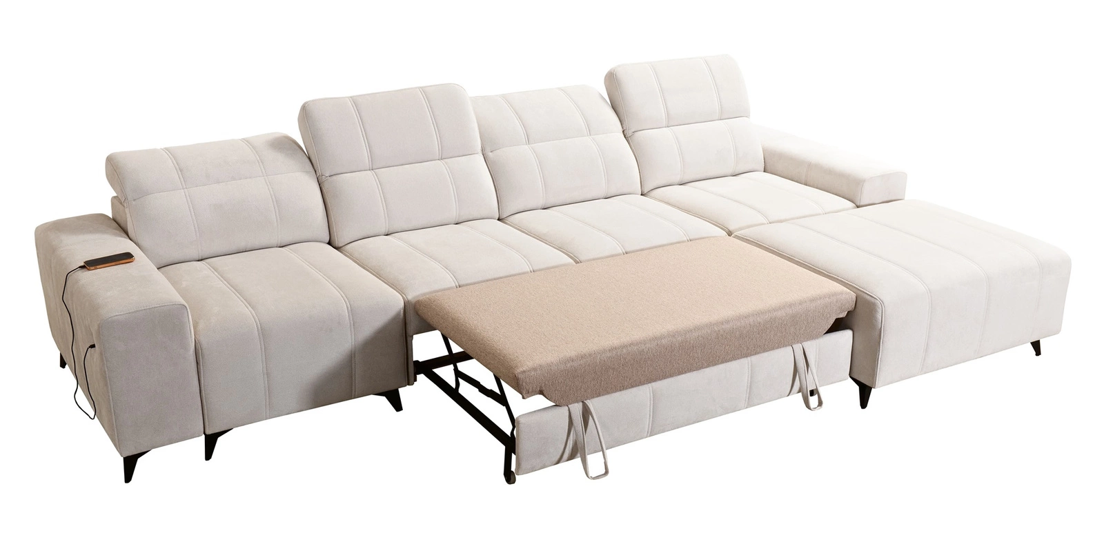 Die Extras dieses Möbels, die alle Nutzer zu schätzen wissen werden, sind die Bettzeugbehälter, die Schlaffunktion und die USB-Ladebuchse an der Seite des Eckschranks.