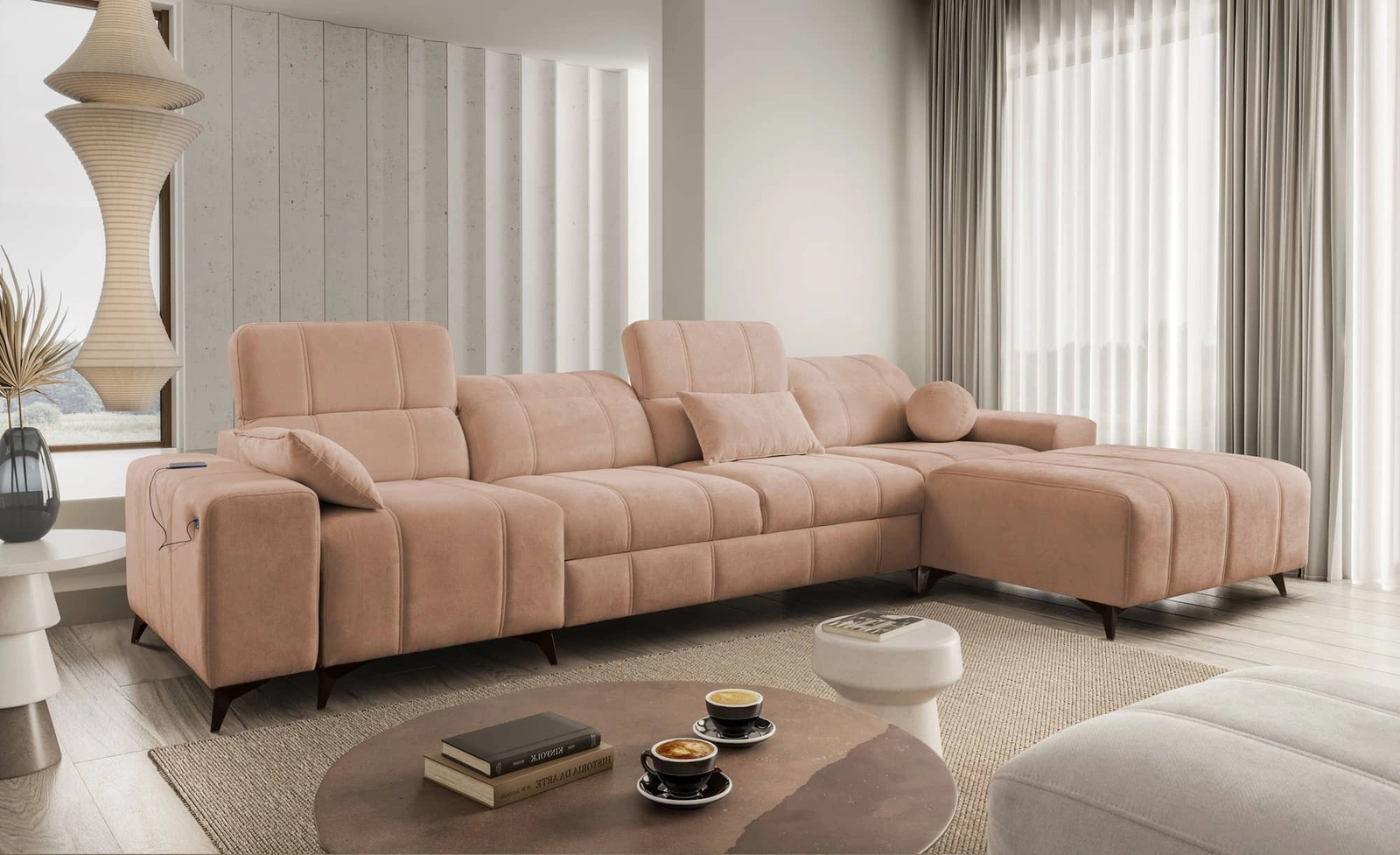 Ecksofa Penejos XII in lachsfarbe mit verstellbaren Kopfstützen ist ein reizvolles Möbelstück mit der Garantie für höchsten Komfort und Funktionalität.