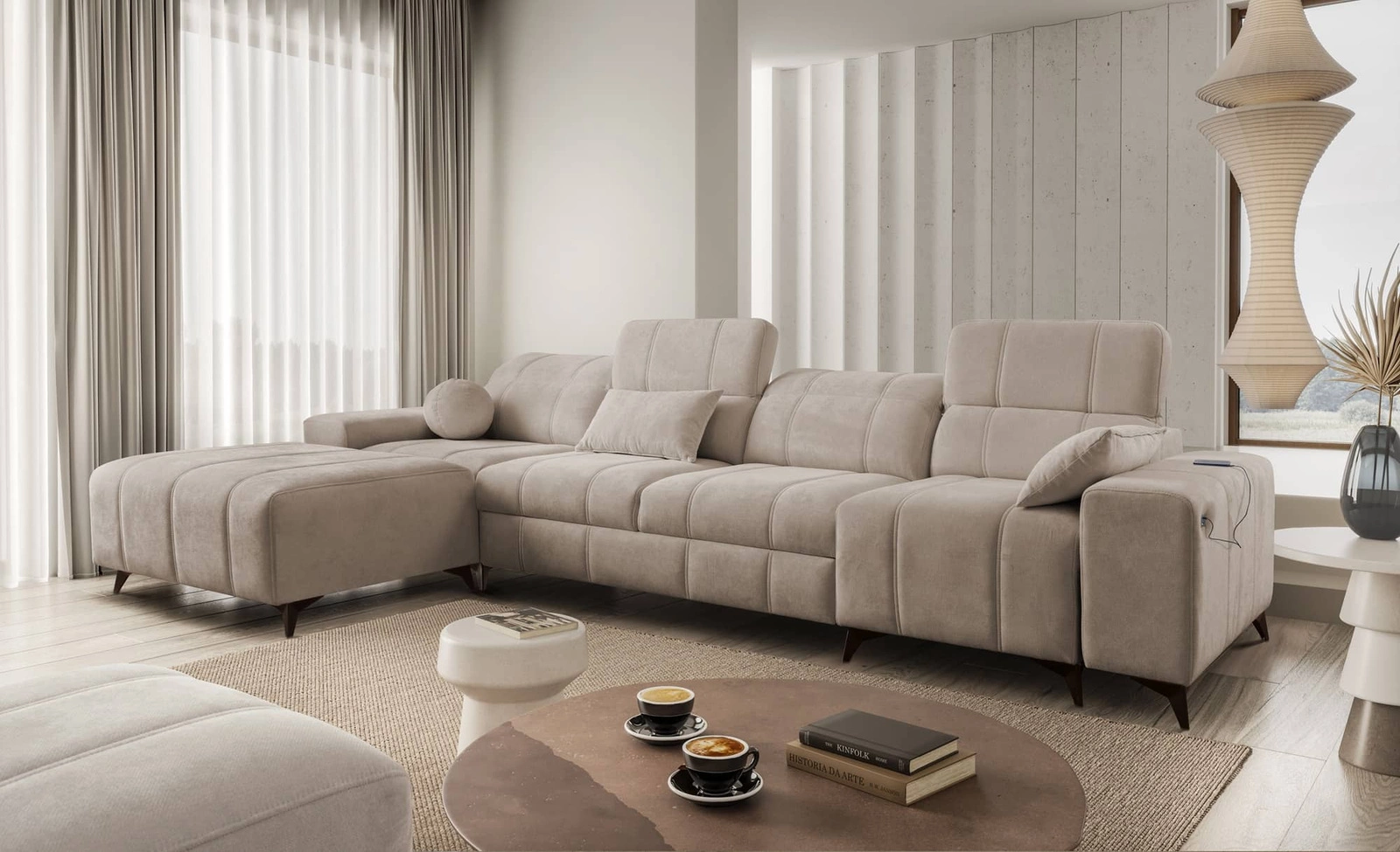 Ecksofa Penejos XII in dunklem Beige mit verstellbaren Kopfstützen ist ein reizvolles Möbelstück mit einer Garantie für höchsten Komfort und Funktionalität.