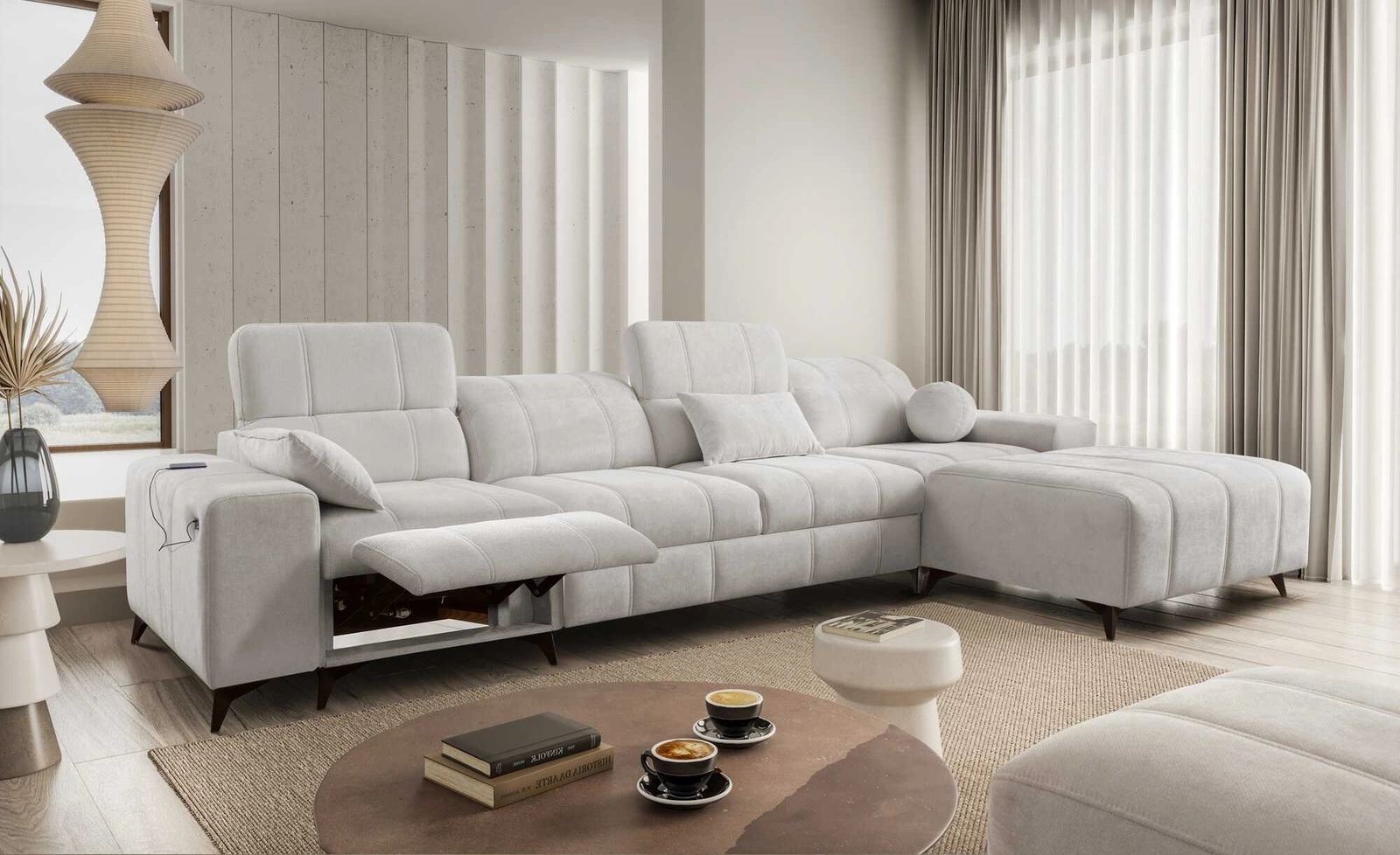 Ecksofa Penejos XII Lux in Esche grau mit ausziehbarer Fußstütze ist ein äußerst bequemes Möbelstück mit interessanter Oberfläche.