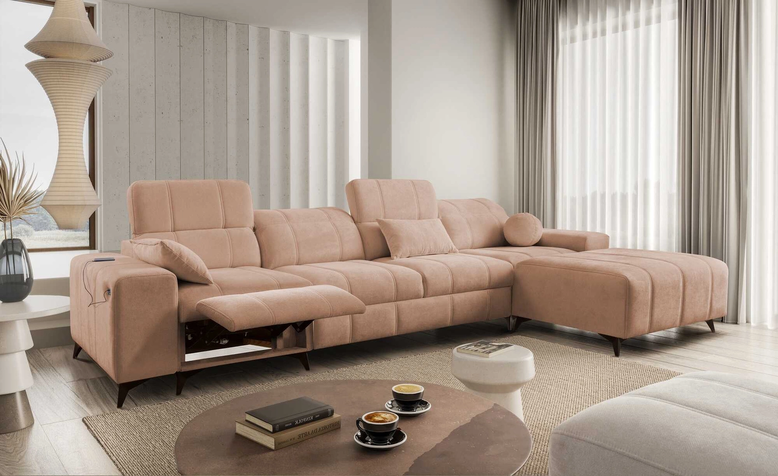 Ecksofa mit Schlaffunktion Penejos XII Lux lachsfarbe rechts stilvolles Ecksofa mit bequemer ausziehbarer Fußstütze