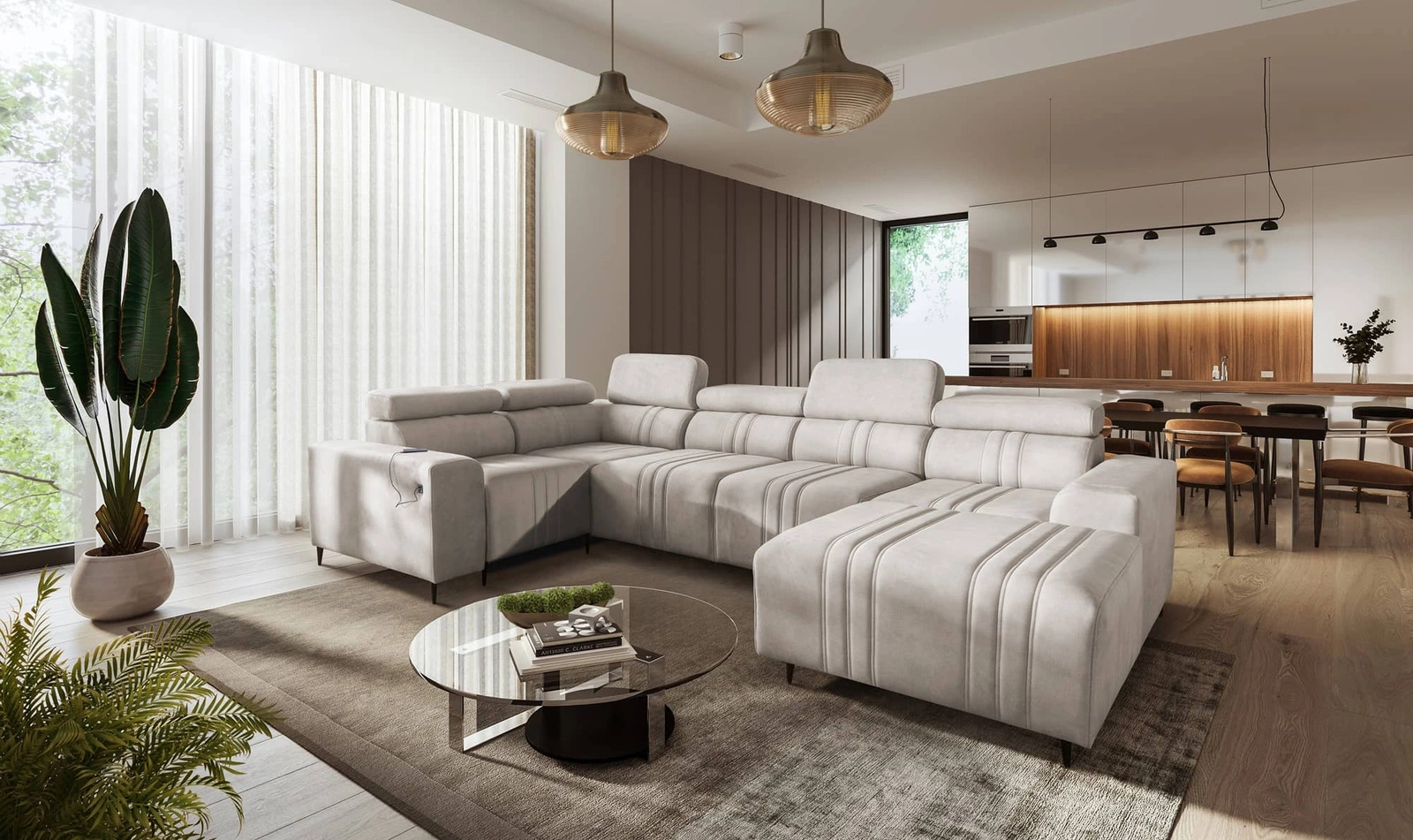 Ecksofa Castel IV in Beige mit verstellbaren Kopfstützen ist ein äußerst elegantes Möbelstück mit interessanter Oberfläche.