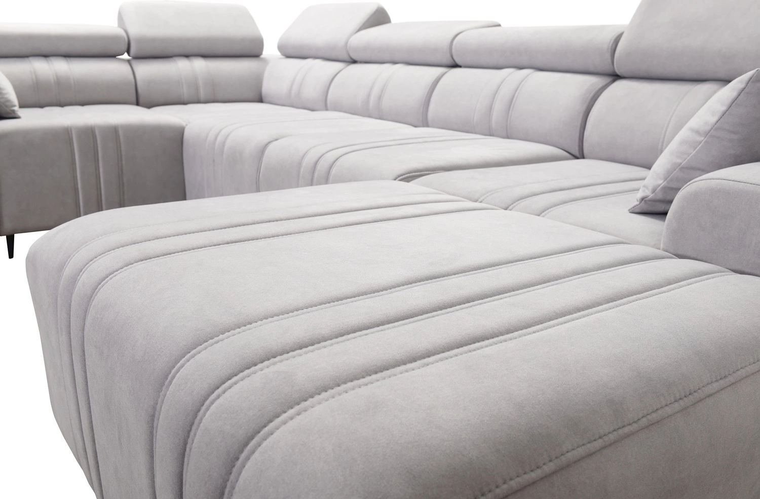 Die Abmessungen der Möbel ermöglichen platz in einem geräumigen Wohnzimmer oder Sitzungssaal zu schaffen. Breite der Ecke 340 cm, maximale Höhe 100 cm und Tiefe 202 cm. Die Liegefläche der Eckeinheit beträgt 132x268 cm. Die Sitzhöhe des Möbels beträgt 49 cm und die maximale Höhe der Rückenlehne beträgt 54 cm. Gewellte Federn und T30-Polyurethanschaum ist das Material, aus dem der Sitz der Ecke hergestellt ist. Feste Rückenlehne mit verstellbaren Kopfstützen ermöglicht eine einfache anpassung sie können die Neigung der Kopfstützen nach Ihren Wünschen einstellen und so für eine bequeme Erholung nach einem langen Tag sorgen, die Sie, Ihre Lieben und auch Ihre Gäste, die auf diesem einzigartigen Ecksofa Platz nehmen, zu schätzen wissen werden.