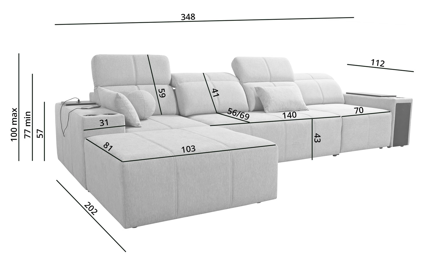 Die Abmessungen der Möbel ermöglichen füllung eines geräumigen Wohnzimmers oder Sitzungssaals. Breite der Ecke 348 cm, maximale Höhe 100 cm und Tiefe 202 cm. Die Liegefläche der Eckeinheit beträgt 138x212 cm. Die Sitzhöhe des Möbels beträgt 43 cm und die maximale Höhe der Rückenlehne beträgt 59 cm. Gewellte Federn und T30-Polyurethanschaum ist das Material, aus dem der Sitz der Ecke hergestellt ist. Rückenlehne mit verstellbaren Kopfstützen ermöglicht es Ihnen, den Winkel der Kopfstützen nach Ihren Wünschen einzustellen und garantiert Ihnen eine bequeme Erholung nach einem langen Tag, die Sie, Ihre Lieben und auch Ihre Gäste, die auf diesem einzigartigen Ecksofa sitzen, zu schätzen wissen werden.