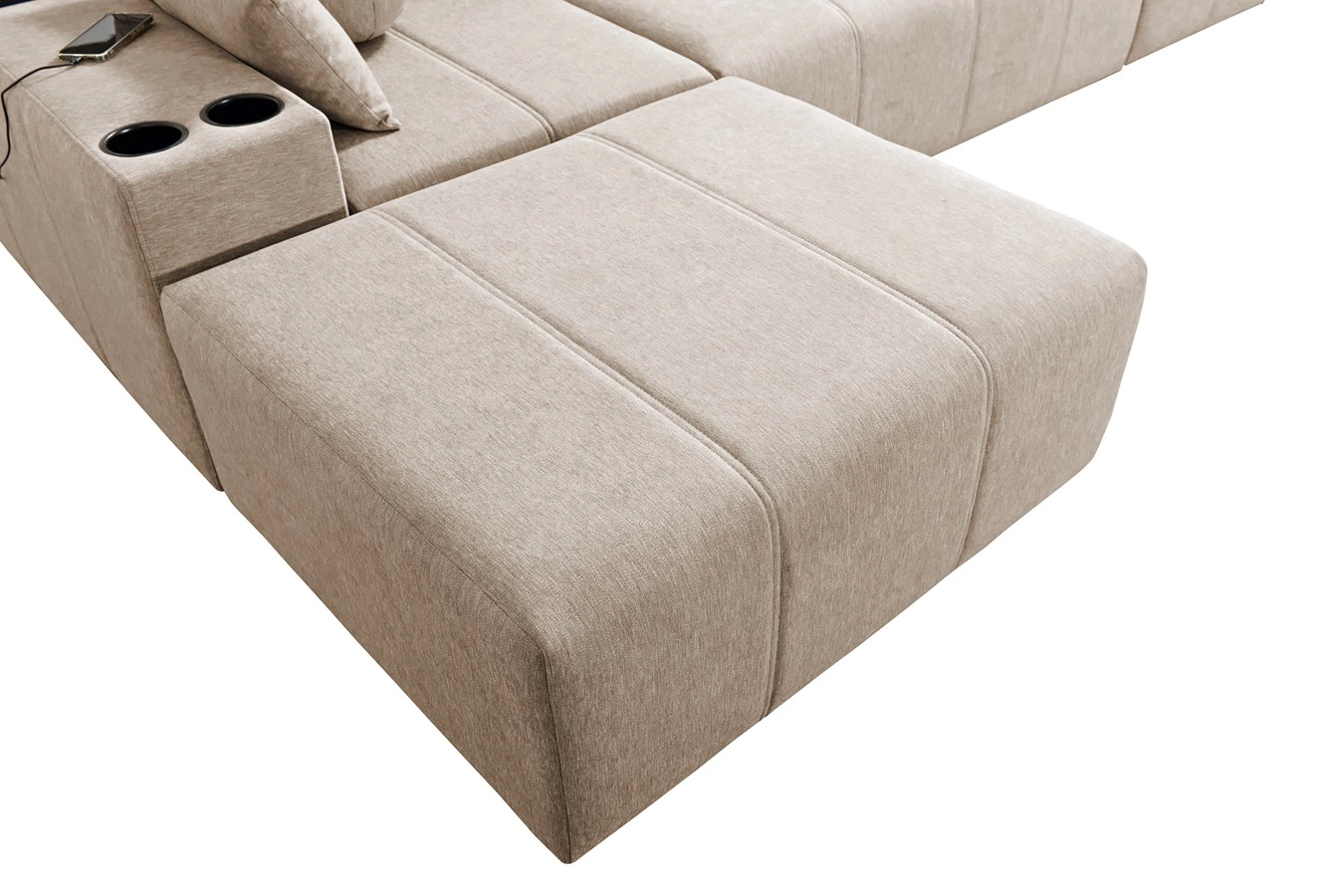 Die Extras dieses Möbelstücks, die alle Nutzer zu schätzen wissen, sind die verstellbaren Rückenlehnen, mit denen sich die Sitztiefe einstellen lässt, die Schublade und die Öffnungsleiste an der Seite der Ecke, die USB-Ladebuchse, die Becherhalter und die Bettzeugbehälter.