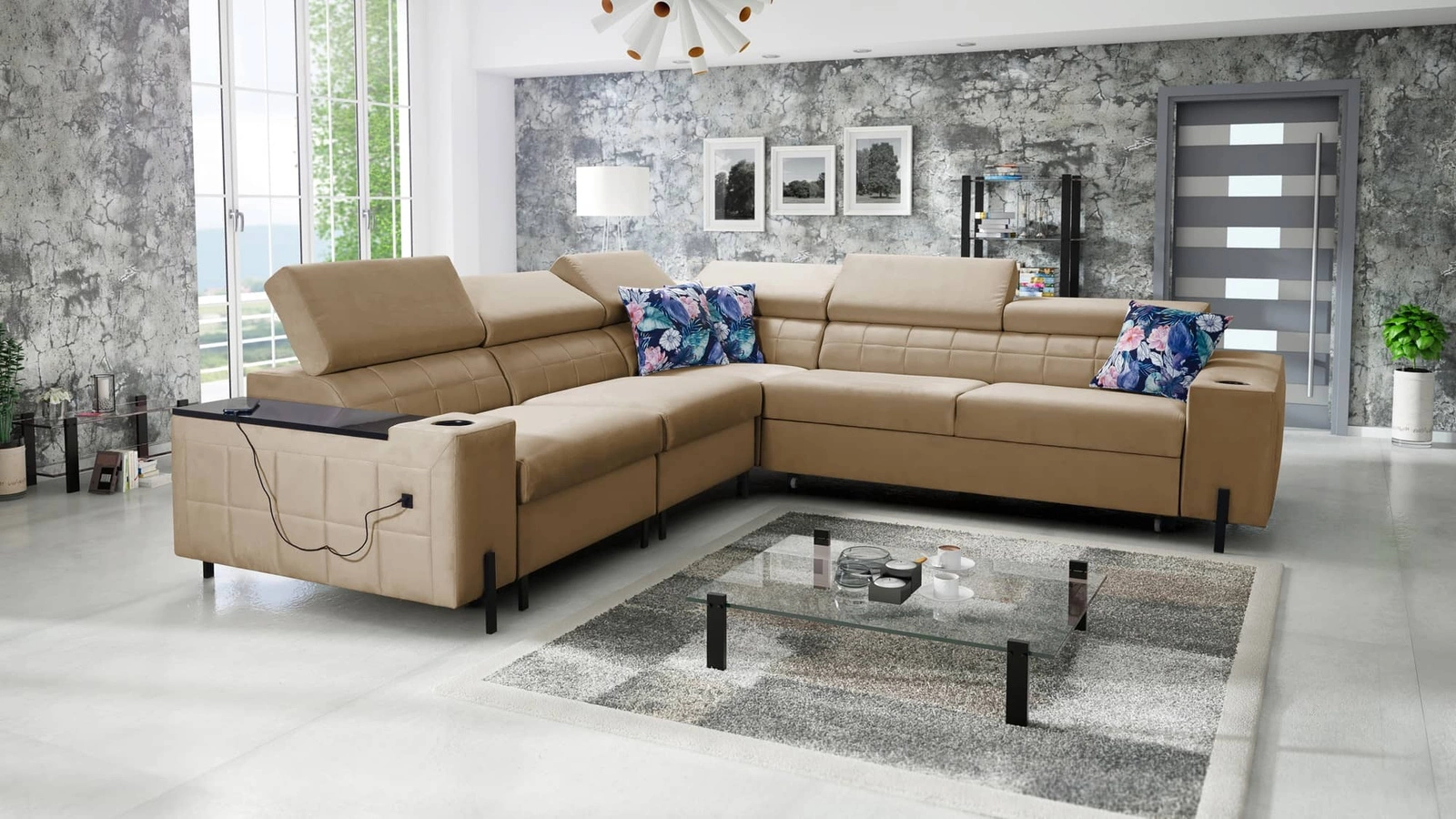 Gewellte Federn und T30-Polyurethanschaum ist das Material, aus dem der Sitz der Ecke hergestellt ist. Feste Rückenlehne mit verstellbaren Kopfstützen ermöglicht eine einfache anpassung sie können die Neigung der Kopfstützen nach Ihren Wünschen einstellen und so für eine bequeme Erholung nach einem langen Tag sorgen, die Sie, Ihre Lieben und auch Ihre Gäste, die auf diesem einzigartigen Ecksofa Platz nehmen, zu schätzen wissen werden!