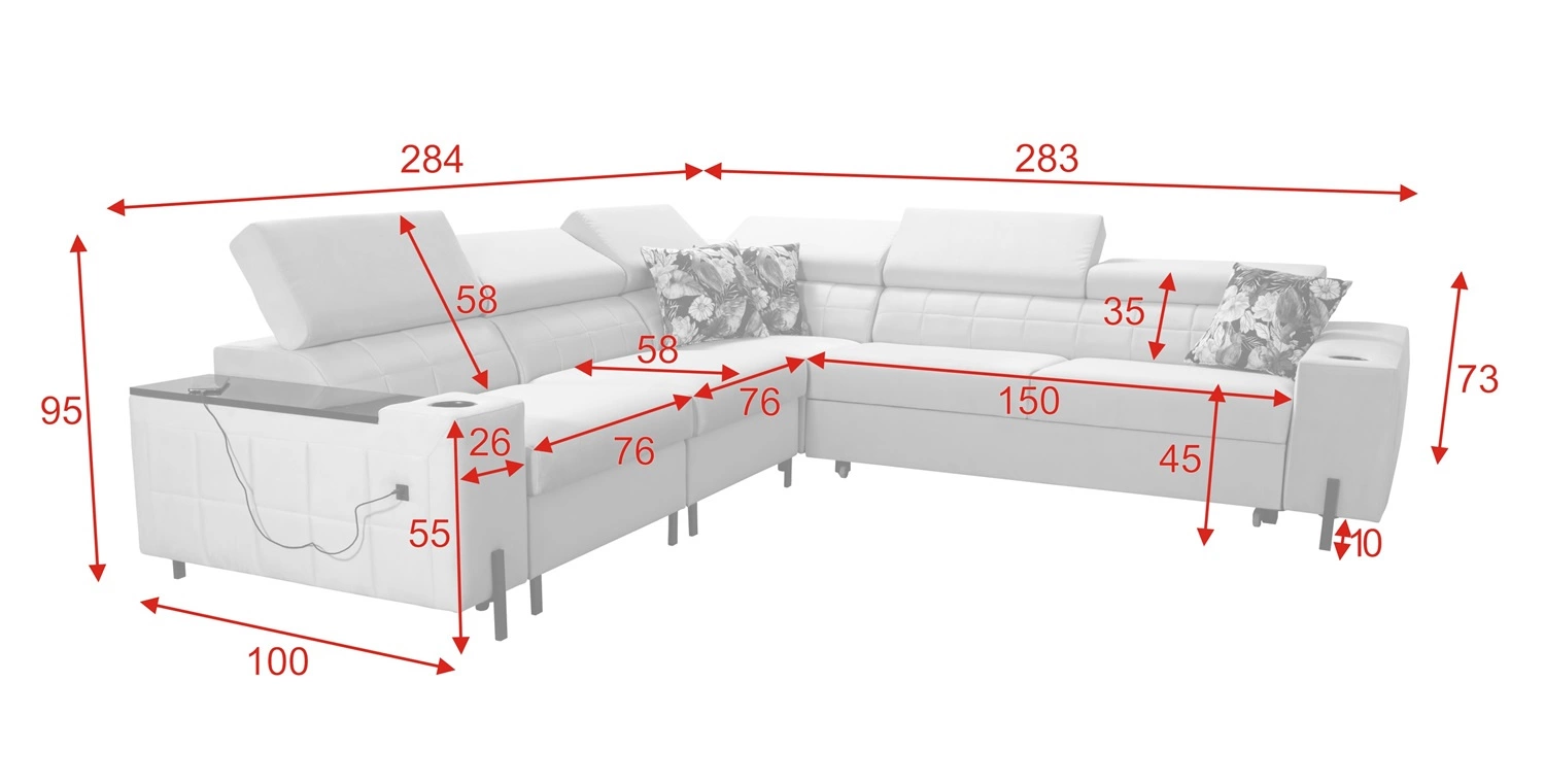 Ecksofa mit Schlaffunktion Belvi IV ist eine Kombination aus zeitgemäßer und eleganter Form, die sich gut in jede moderne Einrichtung einfügt. Die Abmessungen der Möbel sind optimal. Breite der Ecke 283 cm, maximale Höhe 95 cm und Tiefe 284 cm. Die Liegefläche der Eckeinheit beträgt 127x210 cm. Die Sitzhöhe des Möbels beträgt 45 cm und die maximale Höhe der Rückenlehne beträgt 58 cm.