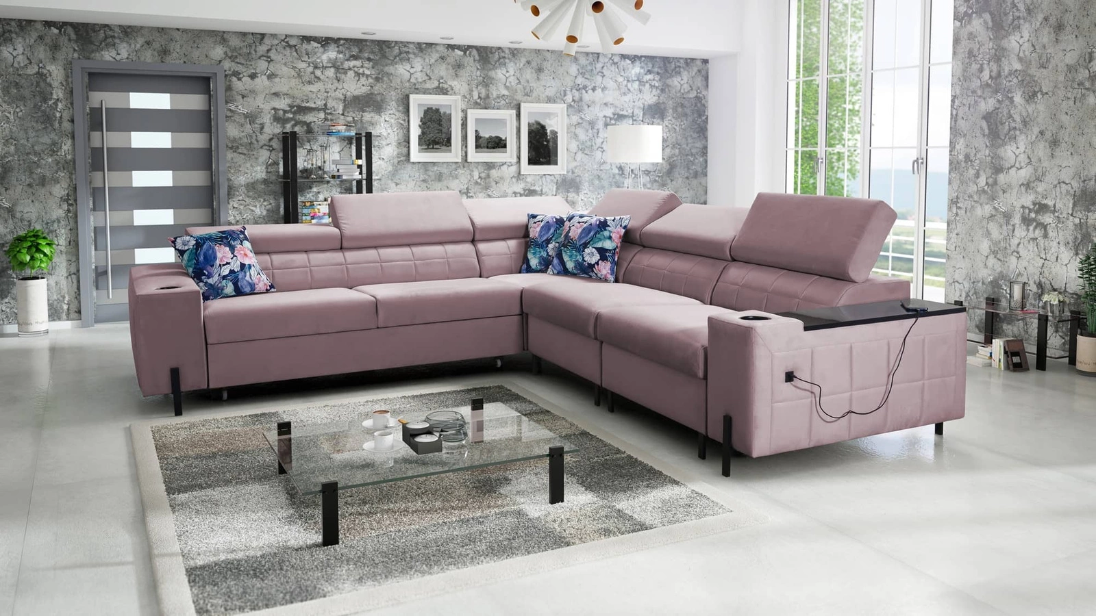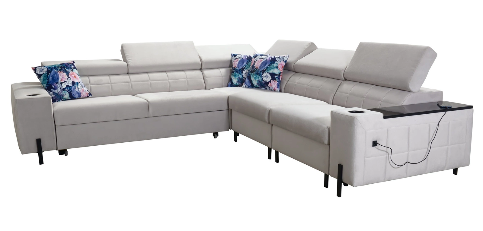 Gewellte Federn und T30-Polyurethanschaum ist das Material, aus dem der Sitz der Ecke hergestellt ist. Feste Rückenlehne mit verstellbaren Kopfstützen ermöglicht eine einfache anpassung sie können die Neigung der Kopfstützen nach Ihren Wünschen einstellen und so für eine bequeme Erholung nach einem langen Tag sorgen, die Sie, Ihre Lieben und auch Ihre Gäste, die auf diesem einzigartigen Ecksofa Platz nehmen, zu schätzen wissen werden!