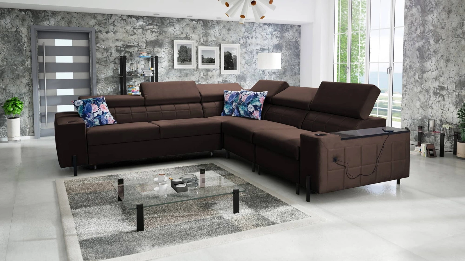 Ecksofa Belvi IV in Braun mit verstellbaren Kopfstützen ist ein elegantes Möbelstück, das sich in jede Einrichtung einfügt.